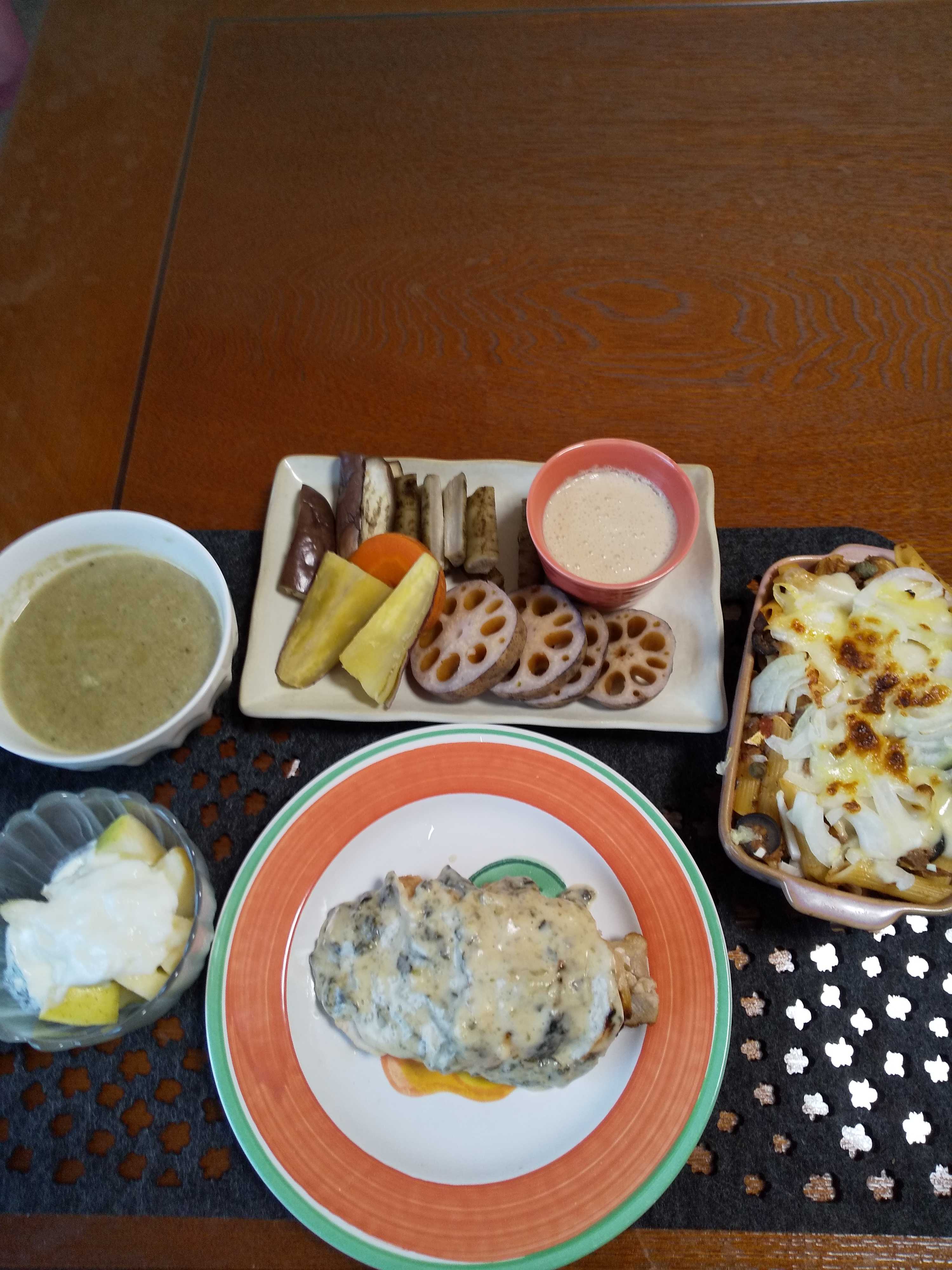 今日の夕飯です。 「和田明日香さん 鶏むね梅チーズロール」を作りました。 「和田明日香さん 缶詰グラタン」も作りました。 茹で野菜のバーニャカウダも作りました。 鶏むね梅チーズロール 缶詰グラタン 茹で野菜のバーニャカウダ りんごヨーグルト 何でもスープ