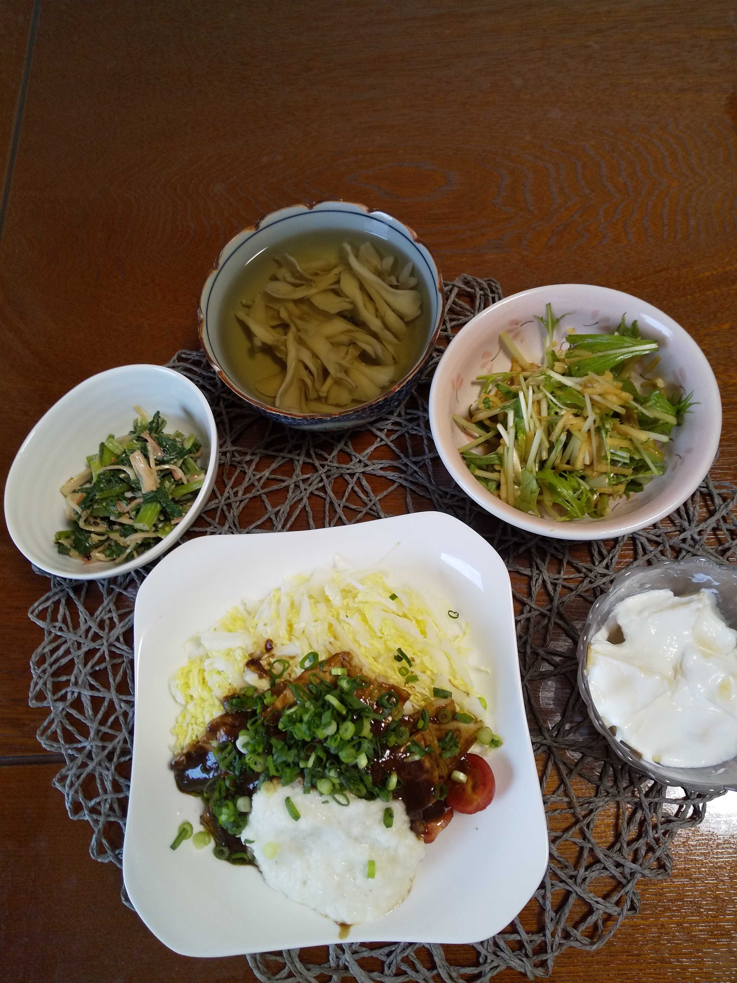 今日の夕飯です。 鶏肉のソテーキノコあんかけを作りました。 鶏肉のソテーキノコあんかけ ふわシャキとろろご飯 蓮根豆腐 柿 はちみつヨーグルト かき菜と人参の味噌スープ
