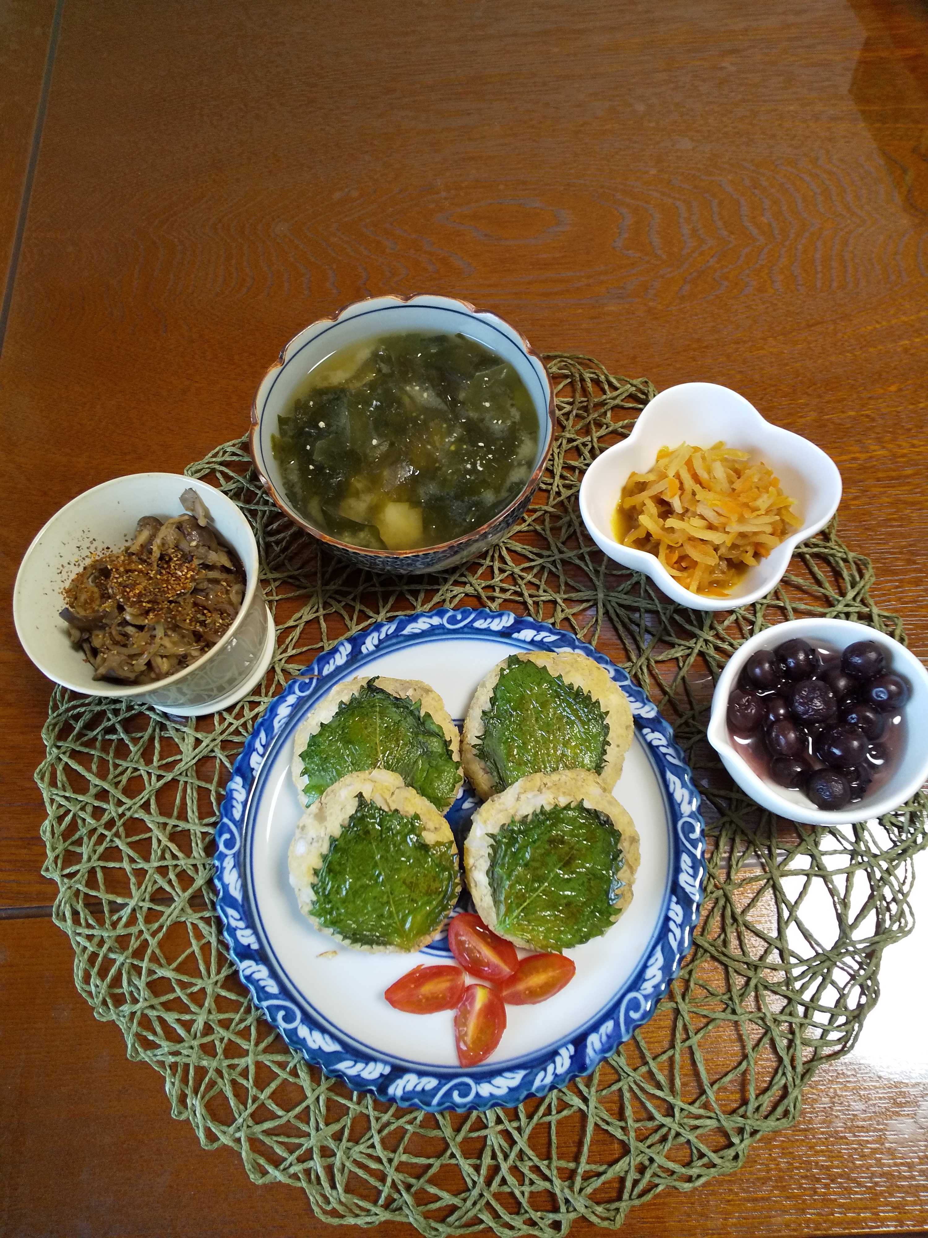 今日の夕飯です。 いわしのつみれとおからと卵と玉ねぎみじん切りとおろし生姜と 片栗粉と塩と胡椒を混ぜ合わせ小判型に整えしそを片面につけ フライパンにサラダ油を熱し弱火で両面焼く。 おからたっぷりいわしバーグ 白滝ときのこの酢醤油炒め 切り干し大根煮 ブルーベリーヨーグルト わかめとじゃが芋の味噌汁
