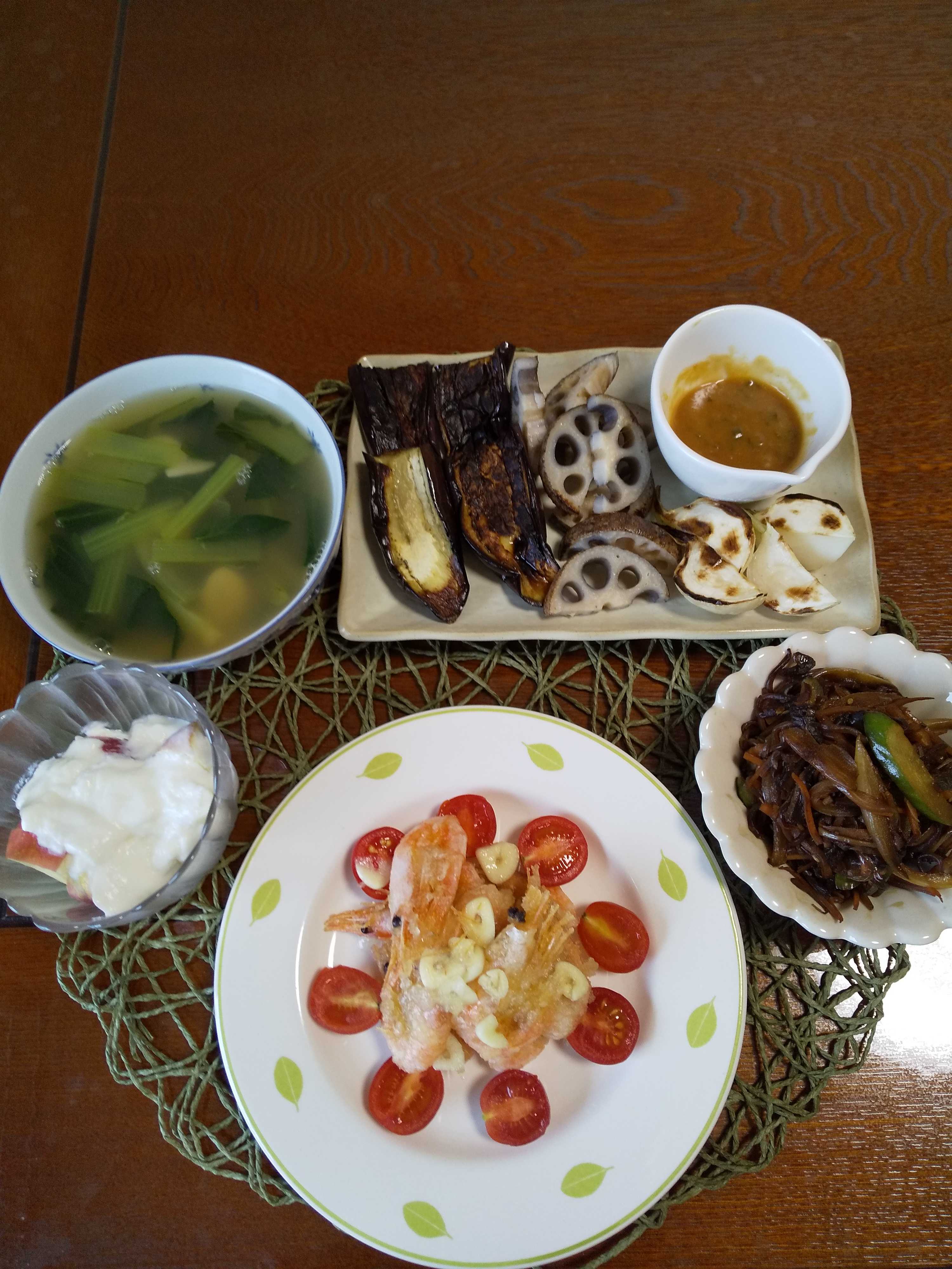 今日の夕飯です。 海老に片栗粉をつけ油で揚げボウルに薄切りニンニクと酒と砂糖に 入れて混ぜよく絡める。 海老の唐揚げ チャプチェ 焼き野菜(蕪、茄子、蓮根)味噌デップ りんごヨーグルト 小松菜と煮干しのスープ