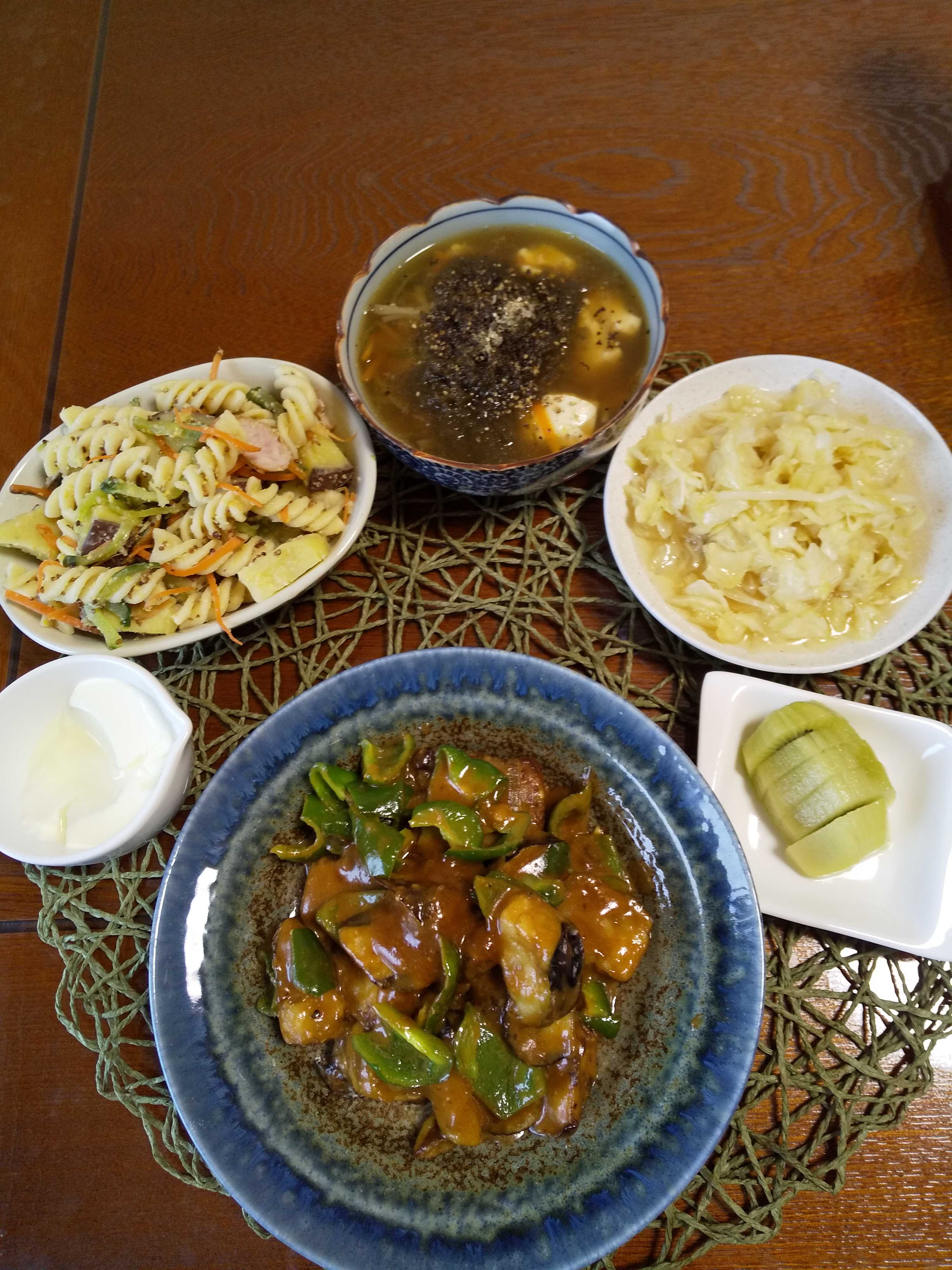 今日の夕飯です。 鯖の水煮缶と茄子とピーマンを使い味噌マヨピリ辛炒めを作りました。 服際にマヨネーズをサラダを作りました。 「田村隆さん 根ブー椀」を作りました。 鯖缶と野菜の味噌マヨピリ辛炒め きゃべつのマリネ さつま芋サラダ キウイフルーツ はちみつヨーグルト 根ブー椀