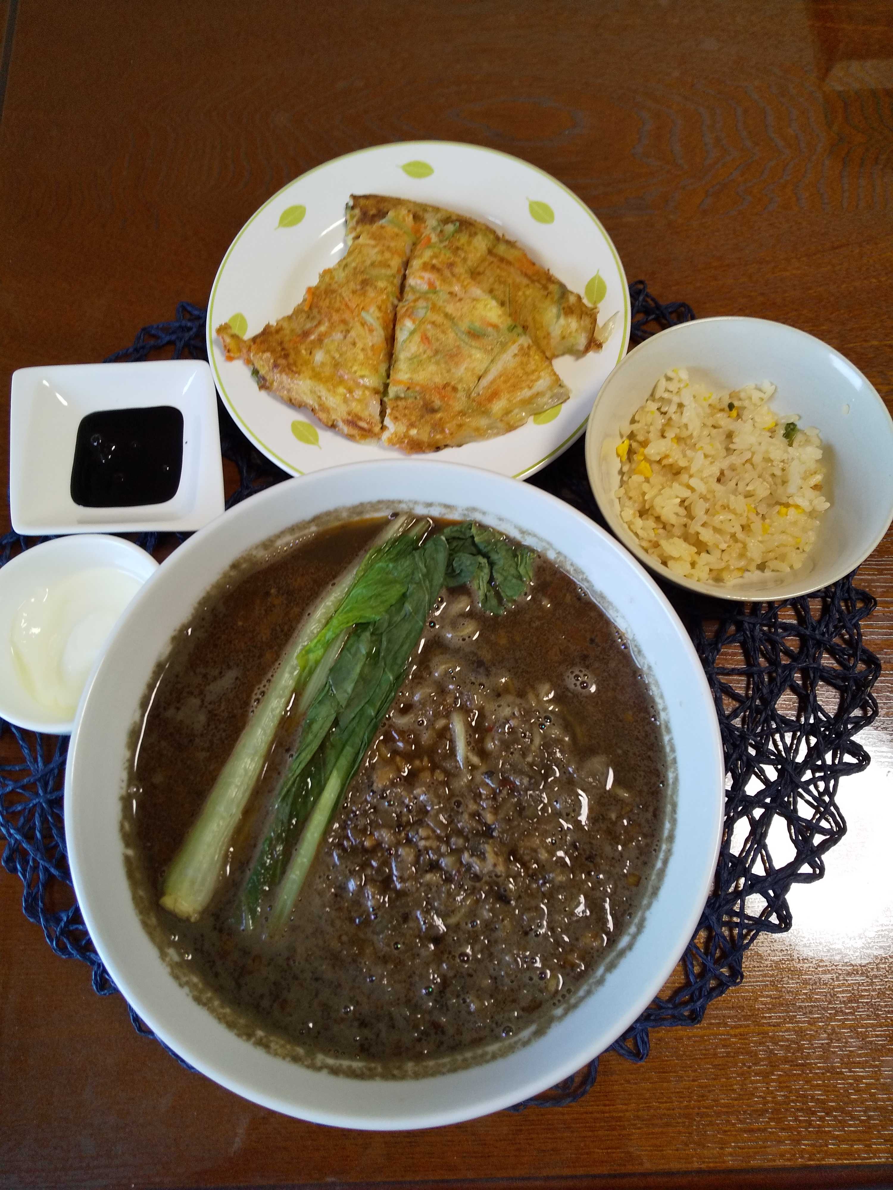 今日の夕飯です。 久しぶりに黒胡麻担々麵を作りました。 青梗菜が無かったので小松菜を茹でて添えて頂きました!(^^)! 黒胡麻担々麵 炒飯 チヂミ はちみつヨーグルト