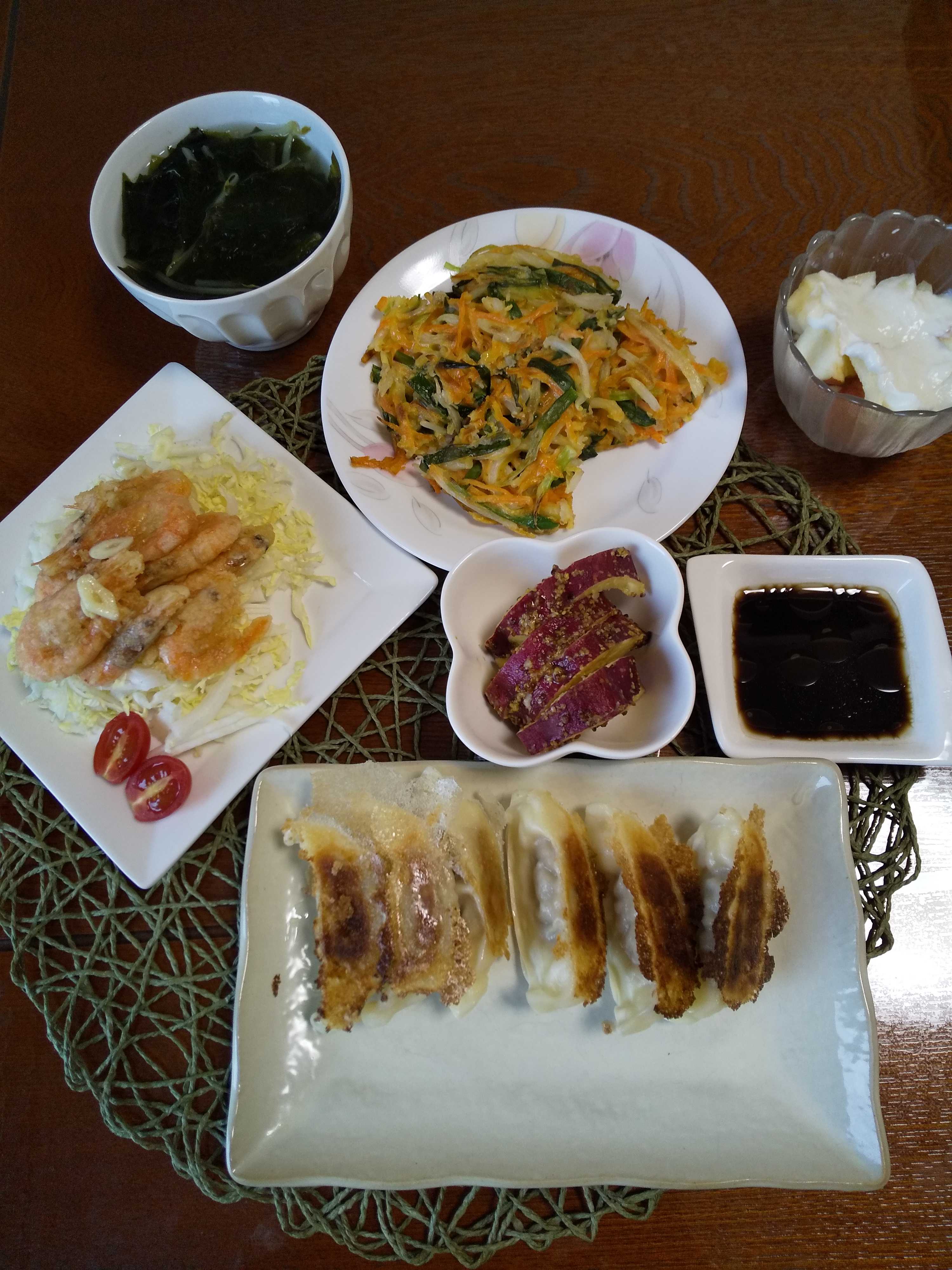 今日の夕飯です。 海老の唐揚げを作りました。 副菜をあれこれ作りました。 海老の唐揚げ 韮と人参ともやしのチヂミ さつま芋ハニーマスタード 焼き餃子 りんごヨーグルト わかめともやしのスープ