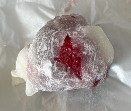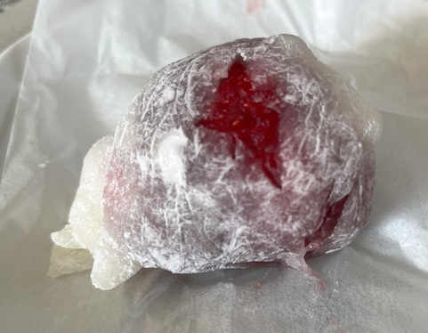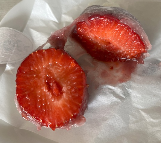 いちご大福、、、だと思っていたのですが、外側の餅が羽二重餅らしく、うすくて、やわらかくて、口のなかでもちもちする餅よりも、とろけていく、、、、そんな食感です。