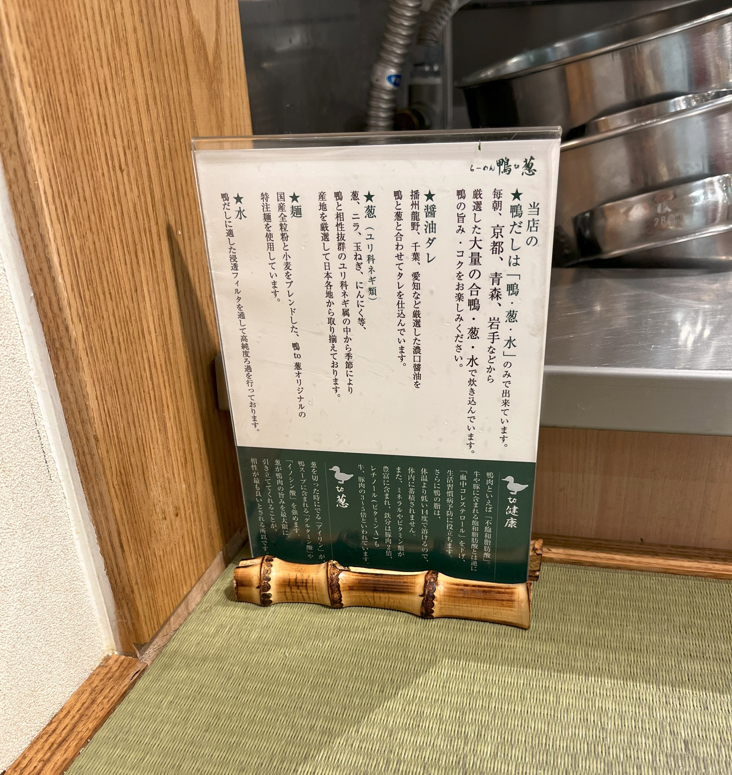 このお店のこだわり、鴨だしは、「鴨・葱・水」のみから出来ているそうです。毎日、厳選した合鴨を葱・水のみで弱火でじっくり鴨だしを炊いているそうな。
