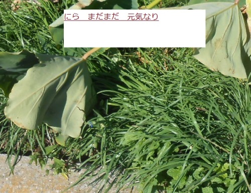 渋がき隊 畑の苗と 庭の苗の比較04月01日 畑の渋柿隊は良く育っている が 庭の 渋柿隊は 良くない柿の木の下で 日陰で 日当たりがよくない やっと 発芽してきているが その後も 成長できないでいる葉は1枚だけくらい これでは 成長は無理みたい落ちた場所がよくないなあ まあ 枯れていないので なんとかなるのかな ?? 庭の渋柿隊は 貧相である畑と庭で どう違ってくるのか しばらくは 様子見をしておこう こういうのも 比較しやすいので 楽しい05月11日 その後の庭の渋柿隊 まだまだ 小さい 小さい畑のは 枝も増えて 葉もたくさんあるが 庭のは なんとか 生えているだけで 成長していない苗つくりは やはり 畑だなあ08月24日 庭の渋がき隊に追肥しておいたら やや 成長をしてきている2本くらいは やっと 伸びてきている ひょろひょろだけと 背が伸びてきている庭のは ひょろひょろ 畑のは しっかりと枝は伸びている しかし 背の高さは 同じくらいになってきている09月14日 ただいま 庭の追肥がきいたのか どちらも おなじくらいの高さになっている畑には 4本の渋がき隊 4本は それぞれ 高さも違っている 葉は多い庭のは 2本の渋がき隊 2本は おなじくらいの高さだけと 葉は少ない葉の大きさは どちらも 同じくらい 葉の数が違う 畑のは 葉がたくさんある10月25日 畑の渋がき隊 そのまま 放置しておこう そろそろ 落葉してしまいそうにら おべんきょうその01ニラ(韮、韭、Allium tuberosum)はネギ属に属する多年草。緑黄色野菜である。科 : ヒガンバナ科 Amaryllidaceae 属 : ネギ属 Allium 種 : ニラ A. tuberosum [1] 学名 Allium tuberosum Rottler ex Spreng. (1825) [1][2][3] 英名 Oriental garlic[2]、Chinese chives[2][3 はた坊