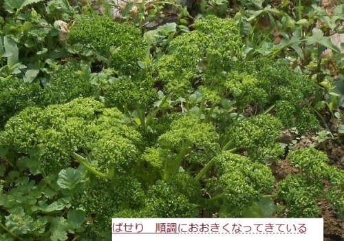 昨年のパセリhcで苗がうられていたので かっておく04月27日 ローヤルで 苗が売られていた 1本 買ってきておく 畑に植えた m-06 05月19日 すこし大きくなってきている 今年も パセリ 1本 畑に植えておく もうすこし大きくなったら また 畑から庭に移動して収穫をいつでも できるようにしよう06月08日 パセリ 大きくなったので 畑より 庭に移動した これで 収穫は便利に06月15日 庭でゆっくりと はせり 育っている07月15日 庭のパセリ 元気になっている やはり 庭においておくのが良い07月31日 青虫がつきだした 5匹を捕まえたが 新手が何度も現れる なんとか 葉は 少しだけは残っている まだ 大丈夫08月22日 そのご 残っている葉は これだけ また 葉が出てきている ほとんど 虫さんに食べられてしまった09月23日 hcでパセリが売られていた 2つ苗をかって 畑にうえつけた m-08に10月05日 その後 なんとか 無事 まあ 大きくなれば゜ また 家の庭に移そう10月27日 ばせり 2本とも 無事 まあまあ11月03日 アゲハの虫が 葉を食べていたので 退治した11月09日 その後は 虫はいない 無事なり12月01日 虫にかじられたのは 枯れてしまった12月08日 残りの1本も あまり 元気はないなあ 今度は 夜盗虫かも ??12月15日 残りの1本 なんとか 無事かな12月31日 残りもダメになっている 寒くでダメになる今年04月20日 hcでばせり 1本をかっておく g09の畑に1本を植えておいた今年も ぱせり まずは1本05月25日 その後 あまり成長していない まあ そのうち 大きくなるだろう と いいながらも パセリ 成長していない で 8月31日 追加で hcで2本のパセリの苗を買ってきた m-08の畝に植えておいた ばせり 今年の2回目の栽培 今回はなんとか なるだろう09月13日 その後 無事なり 今の所 ok/ok/ok10月19日 パセリ 成長してきている 秋は どんどん成長してくれている大きくなっている ぴーまん おべんきょうその09食材家庭で保存するときには、密閉を避けて7–8°C程度の場所に置くのがよい。それよりも低温の場所に長時間置くといわゆる低温障害を起こし、果肉の張りが失われる。日本の一般家庭で広く普及したのは、第二次世界大戦後の1950年代以降である。はた坊