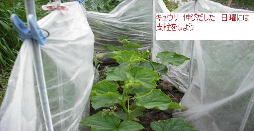 4月18日 畑のm-22にキュウリの苗 6本の植え付けをした  風除けをつけておいた