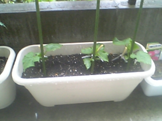 連作障害が気になるのもありますが、何よりまだ畝が空かないのでプチトマトとキュウリは家の裏庭(って程で無く通路)でプランター栽培となりました。キュウリは日々の水遣りが大切ですし、何より収穫期を逃すと一気にヘチマのようになってしまいます。品種は、鈴成四葉です。プチトマトもちょこっと料理に使うのに手近にあったほうが便利、ってことでこの2種類が選ばれました。左2株がアイコ、右2株は千果です。東側になるので夏の午前中の陽射し除けになってくれるでしょう。そういえば、家内がこの隣に朝顔も植えてました。たしか、空きのプランターにシソも植えるとか。。。だんだん裏庭も畑化していきそうです(^^;
