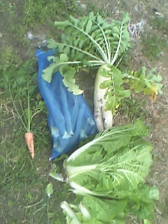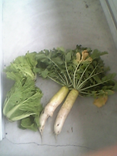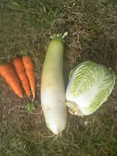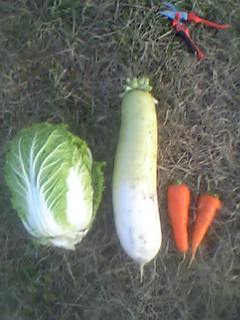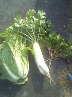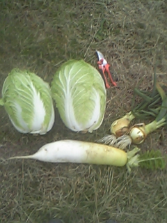 こんだけ寒くなると出勤前に畑に行くのがかなり辛くなります。っていうか、朝起きるのが遅くなりますね。子供も前は6時半にはバタバタ動き回ってたのがこの頃は7時半でも布団の中で丸まってるのでこっちもなかなか目が覚めません。畑の作物もこの時期はのんびり成長してるのでせかせかと見に行く必要もないので助かります。ってことで、土曜に畑に行ったときの収穫です。(更新も遅いです;汗)定番の大根・白菜・ほうれん草です。写真に写ってませんがニンジンも収穫したのですが、これが、野菜嫌いの3歳の娘が生のまま、マヨネーズだけでバリバリむしゃむしゃと食べてしまいました。これにはびっくり。 私も食べましたがスーパーのものとは甘みが全然違いました。晩御飯の鍋料理に使うので白菜を半分に切ったところ。ちゃんと中までしまってますね。