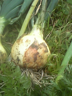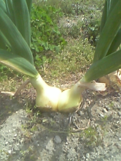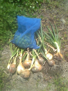 連休真っ盛りです。各地では大渋滞のようですね。今年は引越したこともあり、連休は家で大人しくすることにしています。去年もGWに夏野菜の苗植えをしましたが、今年は冬からの引っ張っているものが多くて畝が思うように空いていません。とりあえず今すぐ使える畝に、カボチャ・トマト・ナス・ピーマンを植えました。スーパーで買ったニンニクが思うように育たなかったのでそれも全部撤去して以前に職場のパートさんにもらった生姜もナスの株の間に植えてみました。生姜は、水が大切らしく家から離れており毎日水遣りできる環境でないのでダメもとです。カボチャの株間に黒豆も蒔きました。一斉収穫したホーム玉ねぎと、サヤエンドウです。玉ねぎはグレープフルーツほどの大きさもありました。サヤエンドウはこんなにたくさん採れました。サクッとした歯ごたえがたまりません。スーパーの食用ニンニクです。 ミニミニサイズなので醤油漬けにでもします。けど、干してるときに気付いたニンニクの芽を切り取り収穫しました。コレならちゃんと一品できそうです。イチゴもようやく色づいてきました。ほんとは2個ちゃんと赤く熟したのがあったのですが、写真を撮る前に子供の口の中に・・・(^^;