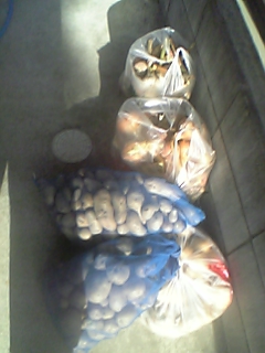 土曜は家族総出で大収穫祭でした。ジャガイモと玉ねぎの一斉収穫です。ジャガイモは、キタアカリとメークイン合わせて収穫袋2袋とスーパーの大きな買い物袋1袋分でした。玉ねぎはスーパーの買い物袋に2袋。中には、グレープフルーツよりも大きなものもありました。ホワイト六片ニンニクも収穫しましたが、食用中国ニンニクの倍以上の大きさで満足です。家の裏でプランター栽培中のプチトマト「アイコ」と「千果」です。プランターのキュウリもやっと収穫されました。先週撤去したグリーンピースのところはオクラの種まきをしました。畑のサヤエンドウも撤去して、堆肥を撒きました。近々ゴーヤの種を蒔く予定です。