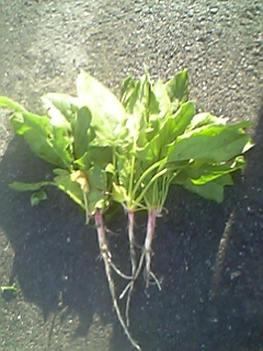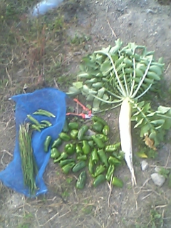 今日、大根を試しに1本抜いてみました。土の上に10cm以上も顔を出して日焼けが気がかりでしたが綺麗な立派な大根に育っていました。葉っぱもすごい力強く茂っております。今日のところは、とりあえず葉っぱだけをいただきました。新鮮な大根葉はおいしいですね。その他、ピーマン大量、オクラ、間引いたニラを収穫。