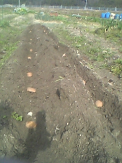 やっと、ジャガイモを植えました。週末の天気が悪くて長引いていましたが、今日は上着なんて全く必要ないくらいの汗ばむ陽気になりました。キタアカリとメークインを1kgずつです。1畝を半分ずつ使って植えました。去年は借り始めたときにはすでに植えてもらってたので収穫だけした形ですが、今年は土作りから植え付けも自分達で出来たので収穫も今からとっても楽しみです。堆肥も腐葉土も化成肥料もしっかり撒いたので去年みたいに肥料不足で成長が遅れることもないでしょう。畑の土手には土筆が出てました。春本番ですね!