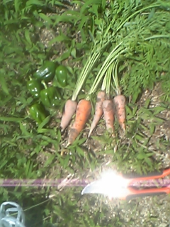 土曜は梅雨の晴れ間でとってもいい天気でした。夏野菜の苗は一通り植えたので特にすることもなかったのですが、せっかくのイイ天気なので子供とオタマジャクシ獲りもかねて畑の様子をみてきました。ピーマンが小さな株なのに実をつけていたので少し早めですが収穫。それと込み合ってた人参も間引きました。今年は、畑の雑草をできるだけ放置する自然農法を試みています。今の我が家の畑は雑草が生い茂って何が何やらさっぱりわからん状態です。トマトはけっこう背が高くなってるので雑草から抜き出て目立ちますナスはツユクサに取り囲まれていたり人参に埋もれていたりします。カボチャは、黒大豆とコンパニオンされてます。雑草をはやしたままにしてから変ったことは、水遣りを少々怠っても乾燥して苗の元気がなくなることが無いことと、害虫による食害が減少しましたが、苗の生長がゆっくりになりました。苗を植える前に堆肥をケチったこともあり栄養不足なのだと思いますが、雑草が土表面を覆っているので乾燥や日照りから苗を守ってくれています。害虫もいるのですが、捕食者のカエルやクモなども大量におり、すぐに食べてくれるみたいです。また雑草も食べるので、作物だけより被害が分散しているのかもしれません。ただ、背が高くて光を遮るような種類の雑草はハサミで切ってしまいます。そういえば、去年は雨の次の日なんて畝の溝が泥んこだったのですが、雑草のおかげで靴もさほど汚れることがなくなりました。後は収穫がどうなるかですが、家族4人が食べるのに不自由しなければOKなのでクリアーできるのではないでしょうか。