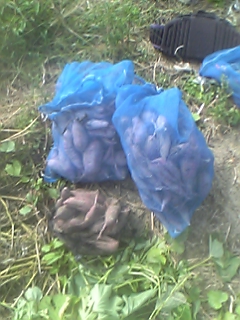 いやぁ~ ここの更新もほったらかしにしてますね(--;今年は梅雨明けが遅かったうえに、8月前半よりもお盆明けのほうが本格的な夏になったかんじで、どうも少し季節が遅れてるようなふうです。うちの畑では、全体的に苗植えが遅かったためにオクラやゴーヤなんかはまだまだ背が低い状態です。ナスも夏の切り戻しが必要ないくらいです。今年の我が家の畑で実施している無農薬、無耕転、無除草の自然農法ですが、お蔭様というか、予想通りというか、収穫量は少ないながらも害虫や病害による被害もほとんどなく順調にのんびりと成長しております。何より昨年と違うのが、連日の猛暑が続いても雑草と刈り取った草を厚く積んでいるのもあり水遣りがかなり省けることです。雑草の下では、ドバミミズが悠々と這っております。炎天下の畑だと、普通は土が乾燥して埃っぽくなり、ミミズも暑さを避けて水路に入ったりしてると思いますし、昼間の株は葉っぱを垂れて暑さに耐えているようです。春にジャガイモを収穫して秋まで空きの畝なんて、雑草ボウボウのほったらかしにしており、ほんとに酷いもんです。ほんとは草を刈っておきたいところですが、雑草の根が土を程よく耕してくれることを期待してあえて何もしません。作物の種類によってはちゃんと除草している畝もあります。それは、サツマイモです。サツマイモは土が乾燥しないと芋が大きくならないそうです。なので、雑草を刈り取って意図的に土を露出させています。当然水遣りもしてません。8月22日の収穫8月26日の収穫もうすぐ8月も終わりなので、秋冬ものの苗作りをしようと思うのですが、まだまだ暑い日が続いてタイミングを見るのが難しそうです。