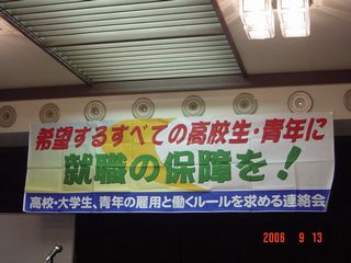 9月13日に県内で修学保障・青年の雇用を求める集会を行いました。高校生や青年労働者などがそれぞれ、発言して「進学するためにバイトをしている」とか「自分は働きたいのに勝手に首を切られてしまった」など深刻な実態がだされました。そこで、ある労働組合の方の報告で衝撃的な事実を耳にしました。みなさん、”青森マーケット”ってご存知ですか?いま、県内の高校生が狙われているんです。県内のある高校では、今年卒業予定者約200人弱に対し、求人が1040強もきているそうです。そのほとんどが派遣会社です!!まともな求人は、わずか30ぐらいだそうです。今、ルールを無視した働かせ方が横行して、青年のみならず、たくさんの労働者を苦しめています。しかし、今、労働者の連帯した反撃も始まっていて、たくさんの成果を挙げていることは本当に重要です。