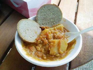 別にワークショップに申し込んでるわけじゃないんだけどふらふらと見に行ってきました。昼間はね、シロートの学習発表会みたいなもんだけどなかなか楽しかったりするんだなこれが。お昼は友達が出店してるらしいのでそこで食べようと。あう、ご盛況だったのだねジャガイモしか残ってませーん。まあ。それでもいいよ。さらえてあげよう。 同居人はお隣のケバブやさんへチキンとラム汁っぽいよソースたまには太陽の下でたべるのもいいのぉ。