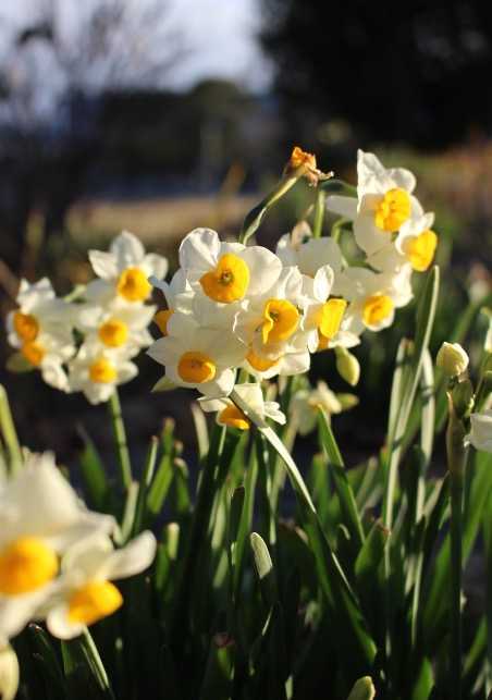 スイセンの花が、咲いていました。よく晴れた 朝でした。神社の境内で、咲いていました。澄みきった空が、広がっていました。