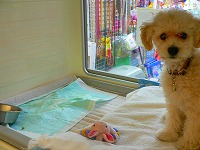 ふた月前にハバナデーでお世話させていただいたプードル(被毛クリーム)のこむぎちゃんがはじめてのお泊りを体験しましたぁ6月30日(火)着いて、すぐ、前にいたことのあるショーケースに 持参のベッドやおもちゃ、水飲みをセットしてご入城 そわそわ落ち着かないようです 大好きなパパとママから離れた不安で心が動揺しているのです そこでお店の子犬パピヨンとプードルとサークルにいっしょに して遊ばせてみました でもぅ消極的なんです こころは自分の家のことでいっぱいなんですね 抱っこしてお店を何周もしてはきをまぎらわせようとしても おいしいおやつをあげてもましたが 「クゥーーン、クゥゥーン」という声はやみませんでした ベッドに座ってはいるので、しばらくようすをみておりました 10時40分、やっと寝入ったようです そぉっと退室しました 7月1日(水) おはよう、こむぎくん ぱぁー、と明るい顔をして出迎えてくれました お部屋にはおしっこもウンチもしていました でも朝のお散歩はきもちいいから出かけようね あいにくの雨もちょうど止んだところ マスコットのうさぎの置物にごあいさつしてましたぁ さぁ、朝ごはんです すぐ食べ始めてくれました。食欲モリモリ♪ おいしかったネ しばらくしてお店の子犬たちと遊ばせました 夕べは借りてきたネコみたいでしたが きょうはちょっとだけ大きいお兄ちゃん役! 力でも負けません!! お昼ごはんを食べて充分お昼寝して、また子犬たちと遊ばせ ましたが、これまた余裕のこむぎくん かっこいいお兄ちゃんぶりを発揮していましたヨ そんな勢いのまま、夕方のお散歩にでたら シェルティのマッシュくんがエントランスで外気浴をしていました そのマッシュくんにもおじけることなくごあいさつ 利発なこむぎくんの、1泊のホテル体験は 大人への窓になれたのでしょうか いえいえ、まだまだ子犬くん むじゃきのままでいいんだヨ♪ ・・・お泊りの様子を報告書にして提出しています ハバナデーのサービス品質です 愛犬の健康ごはんを 考えたSHOPです