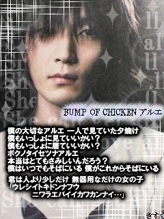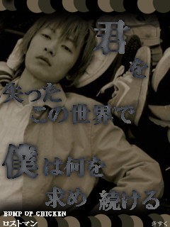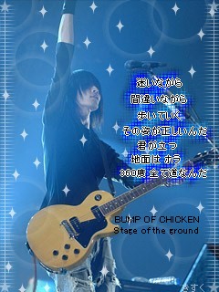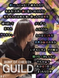 はい自作画一つ更新~BUMPで、ギルド。マジいい曲だよね歌詞といい、メロディといい、声といい。うん、やっぱBUMPは最高だb花の名もいつかつくる予定ー・・・それでは、日記。最近、不幸が重なりあって絶不調でした;;まぁ。。。ここでもいえないイロイロなことがありまして(ぇもぅ最悪だー全部消えろヮーって一旦現実逃避したくなるまでいっちゃったんだけどねひさしぶりに居酒屋行ったんよそんときはバイトとは別に、遊びに。して、なんだかオッサンが3人だけ飲んでた。俺もなんかそういう空気になって会話に混ぜられまして・・まぁ古川のおっさんはいい人たちだったわけです。色々、おっさんたちの話聞いてて軽く元気がでました。時に人の言葉は人を殺すけどその分人に感動を与えるちからもあってすこしおっさん達が大きい存在にみえましたとさ。ワラまじいい人だ。うん。それだけですね、最近は。次はRADの何つくっかな~