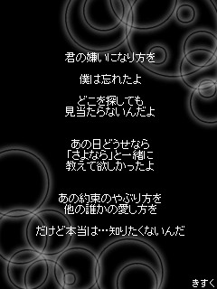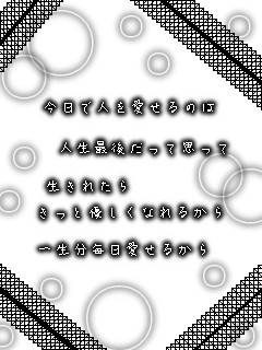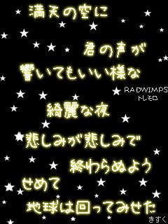 昨日のメール返信来ました。なんつうか・・・うん。今3分くらいで作った歌詞画貼ります(笑今までさなんとなくで見てきた歌詞っだったけど本当にいい歌だよねうんいろいろ気づかされました。うん以上。