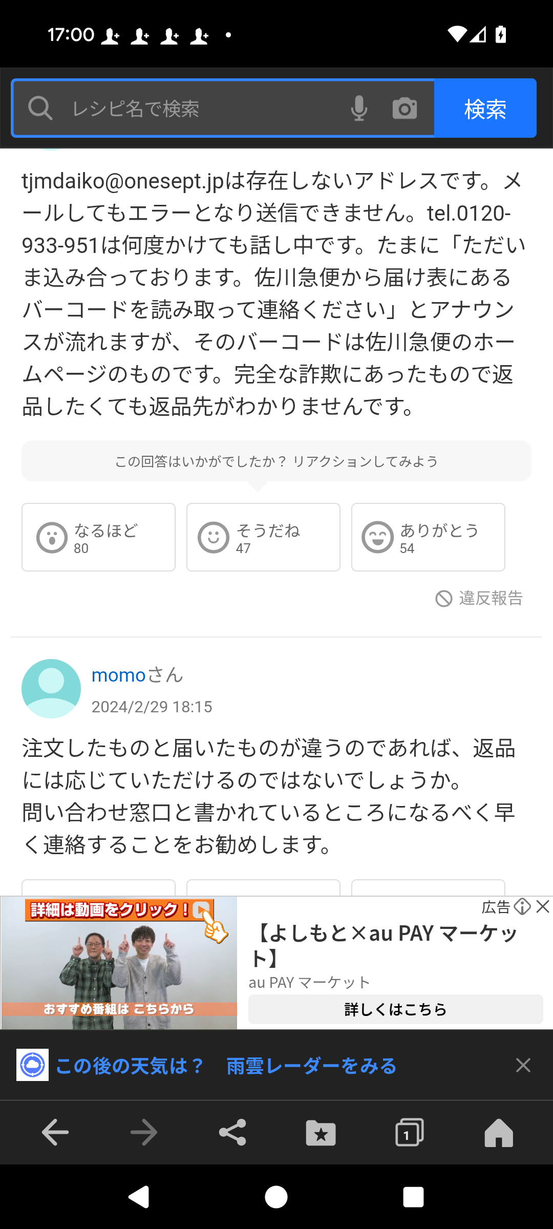 電話は何度かけても話し中。ただし、二度だけ話し中ではなかったことがありました。一度目は「オペレーターにおつなぎします」というメッセージの後にコール音が聞こえてきましたが、なかなか出てくれず、そのうち切れてしまいました。二度目は「オペレーターにおつなぎします」の後にすぐに切れてしまいました。メールも二度送りました。tjmdaiko@onesept.jpは存在するメルアドでしょう。何故なら架空のメルアドならばエラーメッセージが送られてくるはずですから。届いているはずのメールに返信は皆無でした。僕は詐欺を疑いました。警察に被害届を出すことも考えました。しかしその前に栃木市の「消費生活センター」に相談しました。担当者からは、やはり「何度かけても話し中」とのことでした。しかししばらくして進展がありました。返金は現金書留で送る。送料の700円を差っ引いた額を。6月20日に現金が届きました。金額に間違いはありませんでした。製品は6月25日以降に佐川急便が回収に行くから渡してくれ、ということでした。それで佐川急便が来たのが7月7日でした。あまりにも遅くないかい?長い時間がかかりましたが、こうして返金、返品ができました。「消費生活センター」の担当者にお礼の電話を入れました。その時に「どうやって相手側とつながったのか」とお聞きしたところ、おどろいたことに、「向こうから電話がかかってきた」というのです。なるほど。以下は僕の推測ですが、向こうの電話に「消費生活センター」という表示がなされたのでしょう。それで無視するのはヤバイ、とでも思ったのでしょう。「電話番号登録してなくてもかけた側の表示が出るのか?」と、僕は思いましたが、僕のスマホGoogleピクセル8では、登録していないのに「栃木市消費生活センター」と表示されましたから、多分相手側の電話にも表示されたのではないでしょうか?もう一つ、この会社が不審な点は、会社名を明かしていない、ということです。発送者名が「AKD代行倉庫」となっています。もし、この業者と電話がつながらない、という場合は、地元の消費者センターに相談することをお勧めします。