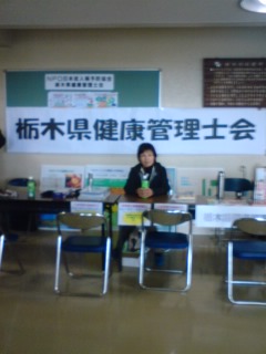 なので、競技は体育館で行われていました。そこで体育館のアリーナの入り口に近いところに机二つ並べて栃木県健康管理士会のブースとしました。