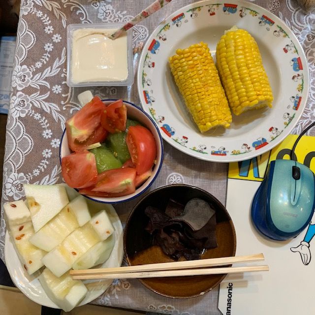 豆腐、ゆでとうもろこし、トマト、キウイフルーツ、マクワウリ、生キクラゲ。