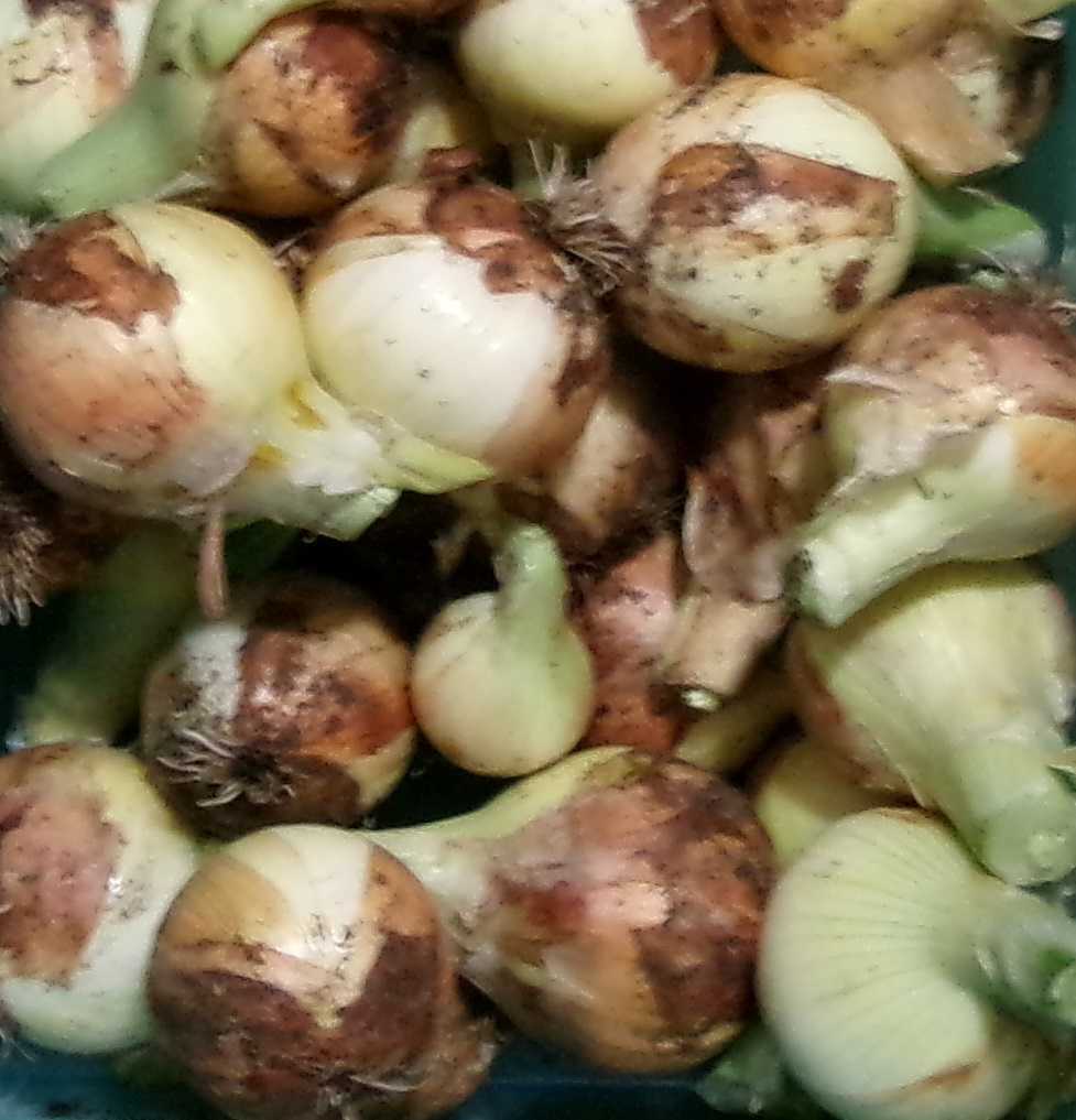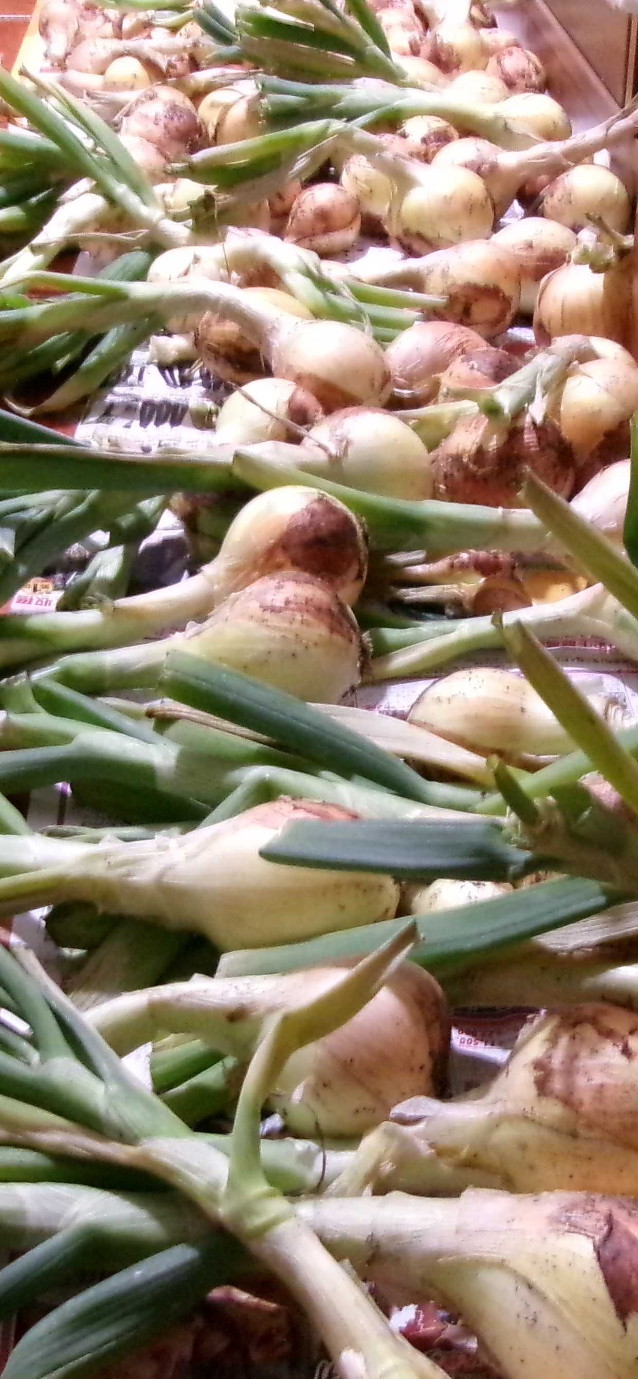 一部のタマネギには、実の中で再びタマネギができる現象が起こっていたので、若い実も収穫します。