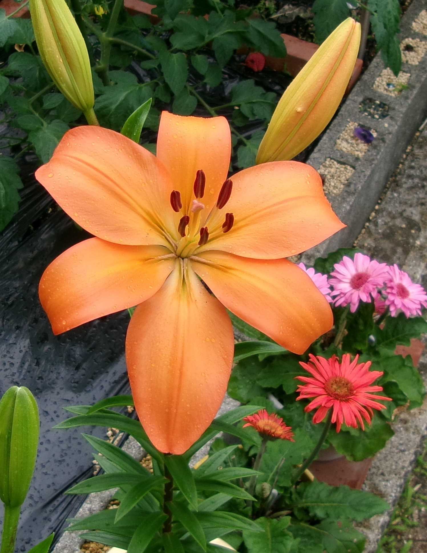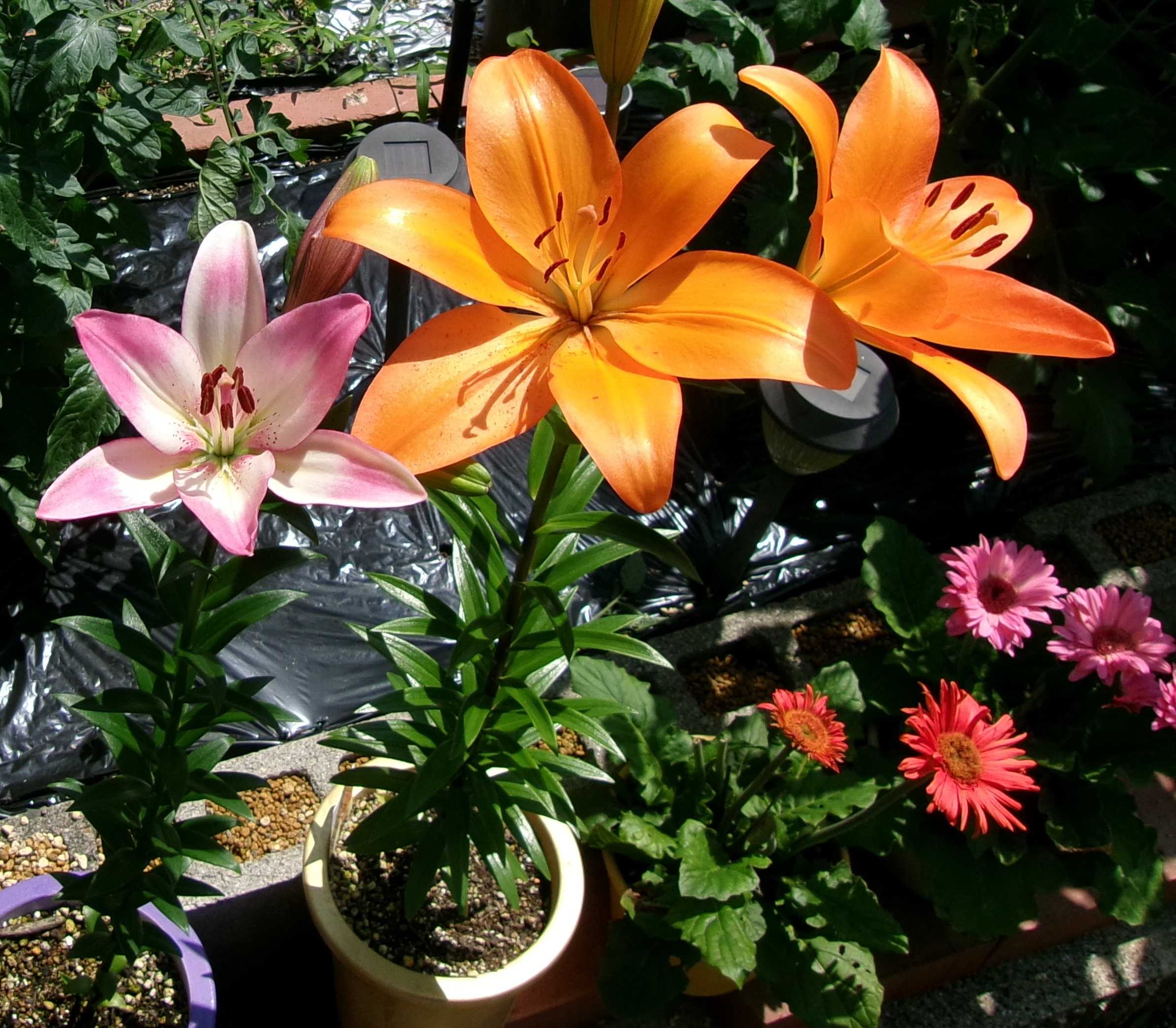 オレンジ大輪とピンクのユリ。見事に咲いてくれました。