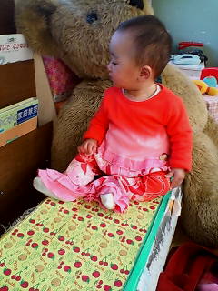 昨晩から、明日の英語はFROWER BONETの気分で。コートがとにかく着せたかった私です。あいにく本日とても寒く、コート日和でした。サヨリさんの福袋のドレスも着せてきました。このドレスやはり可愛いです。なかなか小技がにくい感じですw。 コート袖半分おりまげました。今年はこれで残りいきますよ~。梨鈴愛なんだか、今朝から少々鼻水が出始めてしまいました。12月は本当最悪だったので、風邪には要注意ですね。英語教室のお友達も風邪&熱でお休みで、梨鈴愛だけでした。レッスン前可愛い光景をみたんですが、梨鈴愛と同級生なのですが、もう半年月齢が早い子のクラスの男の子が、すわっている梨鈴愛の肩に両手をおいて見つめあってました。そして頭なぜなぜしてました。その接近姿3分くらいの間です。梨鈴愛はずっとだまってましたっけ。恥ずかしかったのかな・・・と思う限りで。もう1歳半ぐらいになると大分いろいろなことを理解して、できるようになったりするんだ~と思いました。レッスンでは梨鈴愛は一人だから大はしゃぎしてました。終わった後、先生と少しお話していたんですが、「いつも他のお友達がいるときはおとなしいけれど、一人だととっても元気なのですね~。」と。確かに育児学級とかでも大勢人がいるとおとなしくなる・・・というのは前々からおもっていたんですけれど。やはり先生ともなるといろいろなお子さんをみられてるから、すぐ分かるんですね。