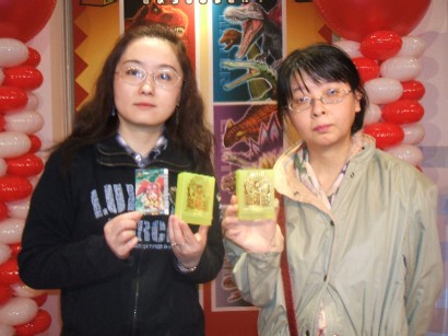今日はアリオで猛者決定戦の決勝大会が行われました。リアルレポをお送りするはずでしたが,どうもネットへの接続状況が悪く,また決勝大会の人数が12人(1人欠席で実際は11人)ということで,40分くらいで終わったことから,即時報告とはなりませんでした(^^;)。そして見事ゴールド猛者になったプレイヤーは・・・普段一緒に大会に参加しているヤスヒロ君が見事優勝し,ゴールド猛者となりました(^^)。決勝は,終盤互いにレッドの状態(両者全爪?)から相手に水の力がみなぎり,もしもあいこになればアクア発動し,往々にしてそういうときに限ってショック発動されることが多いですから,負け確定になるような場面でした。もう勝つしかないという場面で,その一手をものにしたヤスヒロ君。パパさんは珍しくガッツポーズ,ヤスヒロ君はみんなに祝福されて嬉し涙でした(^^)。猛者最終予選の前哨戦となった前日の同ルールの大会でも優勝,そして猛者最終予選でも優勝,そしてそして本戦で優勝ですから,「3200タッグ」はもう任せとけ!って感じでしょうか。で,これら大会はロム変後に行われたわけですが,ロム変後に予選があった分,やはりちょっと有利だったかなという気がします。実際ヤスヒロ君は大会中チェンジも「うまく受けて」いたし,大会全体を通して言える事ですが,ロム変をどう捉えるかで勝負が分かれた感じでした。応援を終え,急ぎホームの恐竜トリオ戦に行きました。いつものようにシャッフルですが,息子は組んでみたいプレイヤーとトリオをつくったようです。私のトリオ,初戦は私珍しく先発でガブ(ディノテクト)で行きましたが,オンする前にダウン(^^;)。ですが,2番手ママさん,大将パパさんの活躍で初戦を乗り切ると,2回戦は今度は大将になった私がボタン1回押して勝利でした。準決勝,大将勝負になりましたが,そっこうスピノに攻撃され,劣勢になりますが,こちらのそっこうノドに土の力がみなぎり,クリスタル発動から巻き返し,逆転で決勝進出となりました。今日こそ優勝してやるぞ!(とは心の叫び ^^;)嫁さんのトリオは,嫁さんのパキケの調子も良く,また2番手ママさん,大将パパさんの活躍で準決勝まで行きましたが,そこで対決したのが息子トリオ。先発同士は息子トリオの先発が調子よく,嫁さんがあっさり負け,そこから一進一退の攻防で嫁さんトリオの大将パパさんが体力半分の状態で大将の息子登場。息子はそっこうエウセンで属性負けでしたが,アンハンもプラズマも発動しなかったものの,そっこうの力で押し切り,決勝進出となりました。え?また息子と決勝で対決?なんか,いやーな予感が私を襲いました・・・(今日こそ!今日こそ!)。決勝,先発同士の戦いは私のトリオの先発パパさんが制しました。ですが,息子トリオの2番手がこちらの先発を倒すと,よこくをうまく使ってこちらの2番手ママさんをも倒してしまいました(フムフム・・・よこくの使い方は分かったぞ・・・)。・・・私はそっこうタルボで行き,相手のよこく失敗を導き,2手勝ってボルケノで2番手を倒すと,相手大将の息子には,負けて発動したデスにより,優勝となりました・・・・・・てな夢を抱いて相手2番手と対決です(^^;)。話を戻しましょう。2番手との初手,よこくで必殺はないだろうとの読みで負け手&パワドレを仕掛けると,いきなりよこく付きの必殺を浴びる私・・・違う!ストーリーが違う!ひとつあいこのあと,また負ける・・・ちょっとぉ!デスどうしたのよぉー(半べそ)そして苦し紛れに放った必殺でしたが・・・これもかわされて負け(泣),息子トリオ,息子の出番がないまま優勝となりました(泣笑)!先発ケイスケ君,そして2番手のヒデトシ君が素晴らしい活躍を見せていましたね。私のトリオ・・・準優勝OTL変な白日夢見てるからだよな・・・この現実を受け止め,明日から前向きに生きてみます!ヒットエンドラ~ン!ヒットエンドラ~ン!(笑)