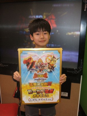 待望の週末がやってきました(^^)。今日は恐竜もありましたが,私はちょっと様子見ということで,ムシオンリーにしました。11時は5周年大会。2倍近い倍率のなか,当選したのは嫁さんと息子だけでした・・・。嫁さんは,初戦劣勢から巻き返し,2匹目では優勢でしたが,「最後の力」に仕留められてしまいました。息子,初戦苦手なちっちゃい子になんとか勝ち,2回戦は超苦手な子に数ヶ月ぶりに最後の一手勝負で勝利。準決勝,嫁さんに勝った強豪ママさんになんとか勝利,決勝へ。決勝・・・息子には「ふうじを入れたからって相手が必殺出さないとか思い込むな」「必殺が光っても相手が負け手を出さないとか思い込むな」って伝えます。決勝までの戦いのなかでもやはり不用意に必殺を食らったり,簡単に負け手出されて負けてましたし,それはこの「思い込み」が邪魔してるんですよね。思い込めばこっちはボタンふたつで勝負しようとするわけですから,相手に付け入るスキを与えることになります。「思い込み」は「相手にさせること」であって,「自分でする」ものではありません。まあ,そんなことを伝えて送り出したわけですが・・・1匹目は息子が取り,相手2匹目に一発あててこちらも2匹目へ。あいこひとつのあと,やっちゃいました・・・お決まりのように必殺被弾で体力イーブンへ・・・。あれほど言っておいたのに,その瞬間「思い込んだ」ようです。被弾した後の一発は非常に大事なんですが,次の一手勝って・・・結果的に必殺を食らったことでばいがえし分が増量され,すてみも加わって,ノーマル手でしたが,体力半分ほどあった相手の体力を奪いきることができ,優勝となりました(^^;)。何が悪かったか分かるか?って聞くと同時に涙ぐむ息子。まあまた「思い込み」で自分がピンチになったってこと,分かったんでしょうね。写真は,4月からご入園のアサカちゃんと,新一年生のマナちゃんに囲まれてニヤける息子です(笑)。このあと私と嫁さんは場所をホームに変えてムシの大会に。息子は残って恐竜大会に出ました。恐竜はベスト8止まりだったようですが,なかなかガブにディノテクトオンすることはできなかった,というより会場全体でもほとんどその光景は見られなかったようです。でも,プラズマはやはり威力を発揮していたようで,これからの主流になるのは間違いないようです。13時のムシペア,結果は嫁さんペアが準優勝,私2回戦負けで,ハイ!ダメ~(笑)。14時半のムシトリオ。嫁さんトリオも私のトリオも初戦敗退で,ハイ!ダメ~(爆)。16時のムシトリオには,恐竜大会に行っていた息子たちも合流です。私のトリオ,これまた初戦敗退でハイ!今日の大会終了~(^^;)。嫁さんのトリオ,準決勝敗退で,これまた終了~。息子トリオですが,やっぱり息子がよけいな必殺をくらってトリオをピンチに陥れますが,大将のタクミ君が1匹半倒してくれて勝ち上がり,という感じで決勝へ。決勝,先発チヒロ君が頑張って相手先発を倒し,相手2番手も攻撃して息子の出番。息子,負けムシでふうじを決めますが,ここでまったく不必要な勝負をしかけ,相手の「最後+すてみ+ばいがえし」を食らってしまいます(呆)。ですが,このあとあいこで2番手を退けました。相手は大将が出てきます。初手負ける息子・・・体力あと1ミリ・・・。ここから一手勝って,次も勝って,また勝って,そして・・・なんと4手連続勝ちで,大将タクミ君を温存したまま優勝となりました。先日の新川でもこのトリオで,しかも同じく大将温存で優勝してますから,相性がいいんですね(^^)。ああ・・・手はまだ悪いけど優勝している息子。手は悪くないと思うも浮上できない私・・・。いや,「悪くない」と「思い込んでる」からダメなんですよね(^^;)。思い込みを捨てて日曜日,恐竜とムシで頑張ります!