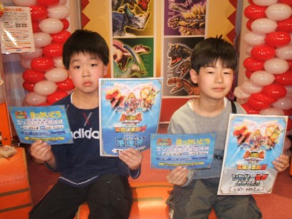 パソコンで見られるトップページの写真ですが,これまで一緒にバトルしてきたカナデ君やパパさん,ママさんが,パパさんの仕事の都合で道南の方へ引越しになるということでしたので,猛者後の合間を縫って記念撮影いたしました(転戦の関係で一緒に写せなかったお子さんもいます・・・すいません)。これからは道南の方で活躍してくれると思いますし,たまに札幌へも来てくれると思います。お体に気をつけてお過ごしくださいね(^^)。さて,今日は猛者最終予選がありました。32人の定員に対し,やはり全道各地から40人が集まりました。抽選となり,強豪も惜しくも落選するなか,息子は早々に呼ばれました。初戦はとつげきサイカにふうじ,控えに風竜を使いましたが(当然ライフはずしてます),支援効果は出ないし,2頭目戦になって,たまにサイクロンが発動すれば相手に土の力がみなぎる状態でしたが,なんとか勝って2回戦へ。2回戦,相手がブラティラを使うので,追加攻撃のある,そっこうアクロにボルケノで,控えにこれまた風を使いましたが,ほぼ1頭勝ちのような状態で3回戦へ。3回戦に行けるなんて,近年の冠で珍しいことです(^^;)。3回戦,苦手中の苦手プレイヤー,ヤスヒロ君にあたりました(笑)。苦手だから,一手に賭けようと先発アルバートにデス装備で,控えにそっこうスピノをもっていきました。アルバートがけっこういい働きをし,相手先発竜を倒し,相手2頭目に一発食らったとき,炎の力がみなぎりました・・・。ここで勝てばもちろん終わりだったのですが,事前に言っておいたデス発動時の手を出さず,あいこでアルバートは落ちます。2頭目,そっこうスピノにパワドレ+カミカゼ+はんげきかいふくで行きましたが,はんかいをストレートに理解して相手のそっこう必殺を浴びる息子・・・そして相手にサイクロン・・・相手の必殺に爪。ここで息子,必殺にあわせちゃって,サイクロンの効果でまた必殺くらって終わりでした(笑)。1頭目でいい感じだと思ったら,2頭目出した途端に2手で終了・・・やはりアルバートにデスが発動したとき,息子の頭の中が,一足先に焦げていたようです(^^;)。これ勝てば勝つって思ったとき,頭の中が真っ白になったのでしょう。リードしてもダメ,されたらもっとダメという息子らしさがやっぱりここで出ました。せめてそっこう必殺+パワドレを活かして欲しかった・・・。まあ,3回戦まで行ったということでちょっとは頑張りましたね。そして!息子に勝ったヤスヒロ君ですが,準決勝を最後の一手勝負で乗り切ると,その勢いのまま優勝となりました。ヤスヒロ君,シルバー猛者,おめでとう!(^^)左は,惜しくも準優勝でしたが,決勝大会への切符を手にしたキョウスケ君です。先日代表入りしたセイカちゃんの弟で,これで姉弟で決勝大会で頑張ることになります(^^)。hamuhamuさん,おめでとうございます。みんな決勝大会,頑張ってね!(^^)。猛者が終わったあとの恐竜トリオ戦で頑張ったのは・・・嫁さんトリオでした。1回戦はシードでしたが,私のトリオに勝ったトリオに2回戦で勝利。準決勝は,息子トリオに勝ったトリオと対戦でしたが,さっきの息子と違い,はんかいを囮に,勝ち竜パキケでまず必殺を決める嫁さん。その後はトリオのママさん,パパさんが頑張ってくれて決勝進出でした。決勝,先発嫁さんには,そっこうスピノにパウパウ+カミカゼ+あいこバクダンで行かせました。いい感じでカミカゼも決まり,バクダンをつけたあとはあいこで爆発させたりで,相手先発を倒します。相手2頭目も嫁さんの攻撃は止まず,倒してしまいました。そして相手大将にもバクダン攻撃をしかけ,あいこになってはちょこちょこ爆発させます。ようやく嫁さんが倒れたときは,相手大将はもうあいこでも倒れる体力に。こちらの2番手ママさんは雷ですから,体力を消耗しないうちにブリッツが発動しさえすれば勝ち確定です。それで初手・・・あいこ!2番手リエさん,ボタン1回押して優勝となりました(^^)。今月で転勤となるアツシさんと優勝,それもアツシさんを温存して優勝できてよかったです。ぜいたくは言いません,嫁さんが我が家で久しぶりに優勝してくれてホッとしています・・・。このあと急いで場所を移してムシのトリオ戦に出ましたが・・・息子トリオは初戦敗退,嫁さんトリオは私のトリオに2回戦で負けました。私のトリオ,準決勝を乗り切って決勝に行きましたが・・・なんと1匹負けで準優勝でした(泣)。私は完全に足踏み状態です・・・前へ・・・進めません(^^;)。それでも締めはスパに行き,軽く嫁さんの祝勝会をやりました。次週に期待!ですが,ちょっといまの息子は,筋の通った手を出せないだけに,期待薄ですね・・・。ところで,生まれ変わった緑の筐体は,「大ムシナルカイザーZモンスターバトル」という名前?ゲーム?になるようですね(笑)。カウント同時押しであいこになった場合,大怪獣かパワドレか?っていう「叩き合い」になるようですね。これって,相手がちっちゃい子の場合,相手がボタンを押す音をさせたら,