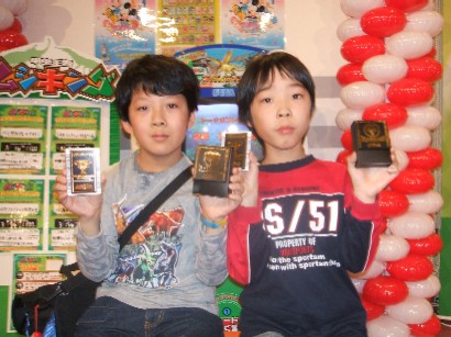春分の日の今日,ドラクエの全国大会予選もありましたが,倍率が凄そうで,きっと出られないだろうから,回避して別所のムシ子供ペア戦&大人ペア戦同時進行の大会に参加です。そのドラクエがあったからなのか,いつもはもっと人が集まるところ,子供で7組,大人は5組しかエントリーがありませんでした。大人ペアの方は,私のペアは初戦敗退。嫁さんペアは1回戦はシードでしたが,2回戦=準決勝で負けてしまいました。息子ペア,強豪ケイスケ君とペアを組むことができて,「足引っ張るなよ~」って感じです(^^;)。初戦,息子がまた我が家の掟をやぶり先ダウン。ですが,ケイスケ君がすかさず大将戦に持ち込み,逆転で勝ってくれました(ホッ)。2回戦,先発を入れ替えてケイスケ君先発。読みが合わずケイスケ君が先ダウンで息子の出番。息子もすかさず大将戦に持ち込み,相手大将には必殺も浴びせることに成功。なんとか逃げ切って決勝に進出です。決勝,またケイスケ君先発。相手の負け必殺よこくに対し,思い切り必殺を決めて有利な状況に。そのまま相手先発を倒し,迎えた大将にはあいこと最後の力で攻め,最後の一手勝負に持ち込み・・・ケイスケ君が勝って,息子の出番がないまま優勝となりました(^^)。今月,息子はムシや恐竜は勝てないんじゃないかと思っていただけに嬉しい1勝でした。ケイスケ君,ありがとう!このあと場所を変えて挑んだ5周年大会は,我が家は特に結果を残せませんでした。大会後,ちょっと「頭文字」をやりましたが,一旦はA1に戻せたものの,またA2に逆戻り。もう23日まで大人しくしていたほうがいいのかも・・・。優勝のご褒美にDSゲームの新製品を買い,帰る前にもしかしたらと寄った店に・・・ありました!「遊戯王デュエルターミナル」飛びつく息子(笑)。まずはカードを買わなくちゃと,リストもないので何が何だか分からないけど数だけはやりました(^^;)。なんかもうさっき見たようなカードが出るようになり,閉店時間も迫っていたので,切り上げてきました。家に帰ってオクを覗くと,全50種ということが分かりましたが,早速チェックすると,1枚だけ「黒炎弾」だけ無いことが分かりました。オクでも安いカードですが,まあノーマルらしいし,きっとこの先相当遊ぶことになりそうですから,そのうち出るでしょう。明日1日働けば,また楽しい週末がやってきます。そろそろ私に金文字ケースが来てもいいかなぁ~なんて(笑)。