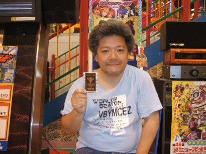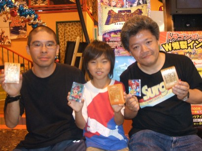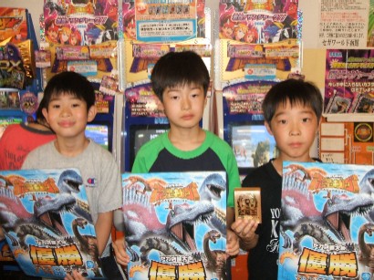 午前中に恐竜キングの大会はありませんでしたが,他の大会は3つ。ひとつはバトリオのイベント,ひとつがドラクエ,そしてムシキング。確実に出られるのはムシキングですが(笑),それはおいといて,息子の選択肢は2つ。バトリオのサファリパックが「参加賞として」もらえる大会にも行きたがったいましたが,大人も含めての希望者のなかから16人にプレゼントならばどうせ当たらないって話になり,ドラクエもあるよと言ったら飛びつくように「行く!」ってことになりました。あとで聞いたらやはり120人くらいのエントリーになっていたようで,きっと当たらなかったでしょう。バトリオの公式HPには「参加賞狙いだけのエントリーは自粛して欲しい」旨の書き込みがありましたが,であればなんで初めから「小学生以下」で,「32人当選で1回戦勝った子にプレゼント」とかにしなかったのでしょうかね。いかにもナムコに対する単なる「集客イベント」ですよね。行かなくて正解でした。行っていたらきっとプレイヤーではない人に当選するところを見てイライラしたでしょうから。で,ドラクエの大会は年齢無制限でしたが,息子だけエントリー。ここも90人くらいのエントリーだったらしいのですが,当然ハズレでした。私はというと,息子と離れてムシキングの大会に行ってきました。ジョニーが来るということで,「本当の叩きを見せてやる!」と意気込んで行ったわけですが・・・。朝,店の到着してから,ちょっと携帯で公式HPを覗いてみると,条件が「中学生以下」になってる???でも店員さんに確認すると,年齢無制限だっていうし・・・。結果的に,セガのというかジョニーが「中学生以下でやりたい」という意見が通ったらしく,大人は出られませんでした(笑)。エントリーしていた私を含め6人の大人は肩透かしでした。でもね,それはそれでいいんだけど,「中学生以下」という条件も,このゲームにおいて中学三年生と小学一年生を戦わせてしまうってのもどうかと思いますが。大人が参加できなくなったこともあり,大会参加者は6人。慎ましやかな大会になりました。大会そのものの時間より,そのあとのサイン会や写真撮影の時間が長かった・・・(^^;)。午前中はそんな感じでしたが,午後からは本日のメインイベントとなりました。12時から恐竜ランダムペア戦。嫁さんペアは早々に敗退。息子のペアも結果を出せず。私はアダーなオヤジペアとなりました。初戦,ペアのパパさんが相手大将まで攻撃してくれて,私はボタンひとつ押して勝利。2回戦は,大将勝負になりましたが,劣勢をなんとかひっくり返して,最後の一手勝負にて勝利。準決勝,これまた大将勝負。またまた最後の一手勝負でなんとか勝って決勝へ。決勝,先発パパさん,あいこのなってもなってもソニック出ず。4回あいこでも出なかったのですが,次勝ってようやくサイクロンが出て,相手先発を倒します。先発パパさんが相手大将に倒されましたが,倒される直前に相手大将のぬいぐるを消してくれて私の出番となりました。ぬいぐるを消されましたが,相手にもぬいぐるがないので気分的には楽でした。私もなかなかソニックが来ませんでしたが,あいこなら勝ちとなった終盤にようやくサイクロン発動。最後の一手勝負でしたが・・・あいこで勝利し,私のペアの優勝となりました(^^)。タカユキさんとのペアというのもなかなか相性がいいですね(^^)。私,連日の優勝ですっかり舞い上がってしまって,次にとんでもないことを・・・13時もペア戦。私のペア,先発の女の子が相手先発を倒してDTティラノは変身。そして相手大将タカユキさんの炎竜に究極をあてて相手をレッドにしてくれました。大将の私の出番。ここは属性勝ちのパタゴですから,もう勝ったものと思ってましたが・・・何やらとなりのタカユキさんがしきりに大会告知の看板の方を見ているし,うしろの子供たちからも「失格じゃない?」なんて声も聞こえてる・・・私,恐る恐る大会告知看板に目をやると・・・ガーン!!!ペア戦の条件が「炎・雷竜を必ず使うペア戦」でしたぁぁぁ OTLなんという失態・・・条件を確認せずに私,水竜を使ってました。当然私は失格・・・黙って負け続けて対戦を終わらせました。あぁぁホントにペアの子に申し訳ない・・・ちゃんとスキャンしていれば勝った(かも知れない)のに(^^;)。そのタカユキさんペア,優勝ということで,私「超アシスト」だったかも(笑・・・いごとじゃないです ハイ)。嫁さんと息子のペアは,それぞれ準決勝までいきましたが,惜しくもそこで両方終わりでした。場所を変えて挑んだトリオ戦も,家族3人はそれぞれのトリオで結果を出せずに終わりました。土曜日曜と優勝できた私ですが,この1週間はちょっと落ち込みそうです(^^;)。