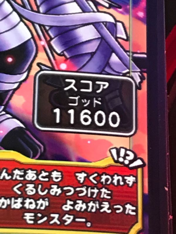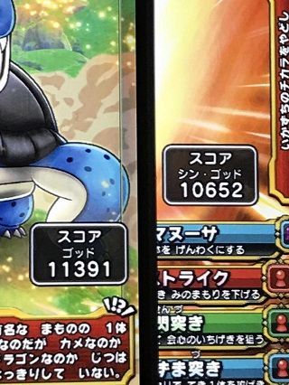 スキャンバトラーズ今日から始まった累計スコアタですが、これまで深夜0時に行っていたゲーセンが閉店時間が早まって検証が出来なくなったので、高速使って30分のゲーセン(それでも市内ですが)に行ってプレイしました。でも深夜の検証は、ドルマゲスが呪いだの眠りだの、攻撃力ダウンとか仕掛けてくるので、こっちのパーティが定まらず、モヤモヤしたまま帰ってきました。 そして今夜の再プレイ・・・初日の結果ですが!息子ゴッドは4ボタン盾の部ですが10332点、私シン・ゴッドの3ボタン盾の部は9841点というスコアで終わりました。息子はどうやらスコアタ用のパーティが決まったようです。私はどうしようかなあ(^^;)。もちろんまだまだスコアは伸びるでしょうし、その延長上に関東エリアがありますから、もう少し検証をする必要がありますね。