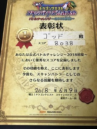 スキャンバトラーズ息子にとって最初で最後、一発勝負の「2018初夏」が終わりました。結果は・・・スコア8038点で優勝となりました(^^)。連続入賞は継続となりましたが、ハイスコアベスト10はどうですかね。ダメで初夏?(^^;)ガードは5回しか来ませんでした。あと1回ガード来ていたら・・・あと2回超グレートが出ていれば・・・まあ、タラレバばかり言ってても仕方ないし、あとは祈るだけですね。 ちなみに私シン・ゴッドは、ダメ計算を間違えて、SPを挿すまえにモグラどもを倒してしまいました!でも、認定証とプロモもらえたからOK牧場ですよ!(笑) 2位は同じチームのしょうりゅうさん、3位はミスタークチームの方ですね。同じくチームゴッドのしかばねさんとあかざばんさんは、大会初参加ということで、スコアアップのキモを今回掴んだと思うので、次回の札幌大会が『本番』ですから頑張ってください。肝心のチームゴッドおやじ対決は、またもやしょうりゅうさんがトップになりましたので、次回の札幌大会でリベンジしたいと思います(^^)。