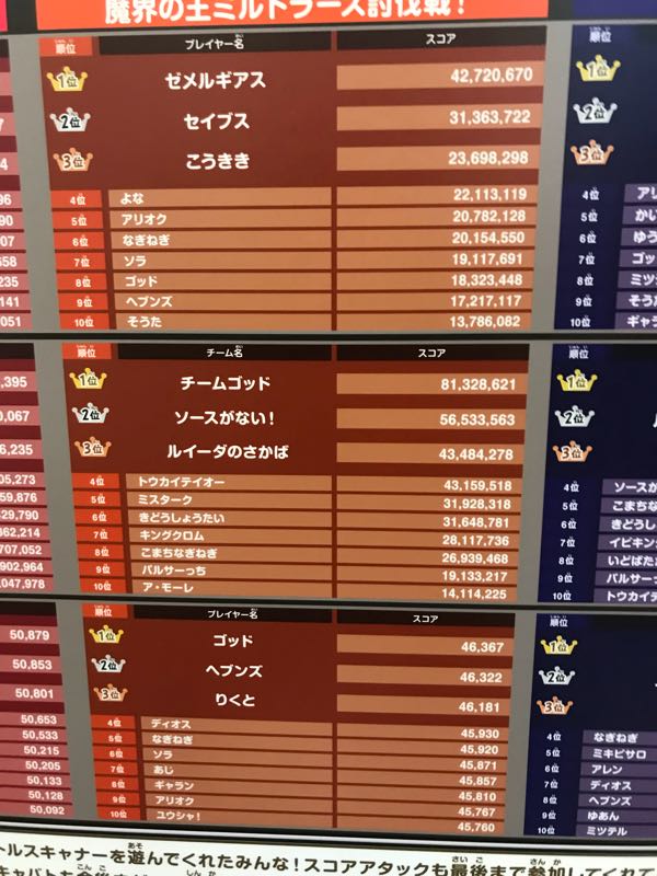 スキャンバトラーズ 予選については、もっと言いたいことはあるけれど、そこはぐっと抑えて! 決勝ステージはとても見応えがありました。 また下克上で予選2位からの逆転優勝となったあーるさん! 関東最強バトラーおめでとうございます! そして小学生以下の部で優勝したこいちゃん、最強東北バトラーに続き、関東最強バトラーもおめでとうございます! 程よいガードに会心が出るとか、そういうバトルは見てるだけでも楽しいし、あーるさんの恐らく日本最速ガードボタン押しが加わるんだから実に気持ちいい優勝でした。 幕張で少しスコアタをしてホテルへ。 そのスコアタで簡単に予選通過出来たスコアが出るし、やっぱ予選は・・・(^_^;)