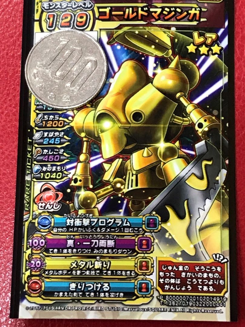 スキャンバトラーズ毎日捕獲しているキラゴルドですが、いろんなポーズにしてるうちに、ベストショットとも言える1枚をゲットしました。それがこれ↓キラゴルドはいつもうずくまる姿勢のため、顔もどうしてもチケの下に寄るんですが、これは顔がほぼ中心で真正面を向き、足や尻尾までちゃんと見えてます。しかもその手・・・これぞ究極のパーでしょう!これまでパーとしていたチケはチョキに認定するとしよう(笑)。昨夜はこの1枚を含み、計3枚ゲットということで25枚目まで伸びて来ました。50枚に至る中間地点・・・バラン星かな(^^)。