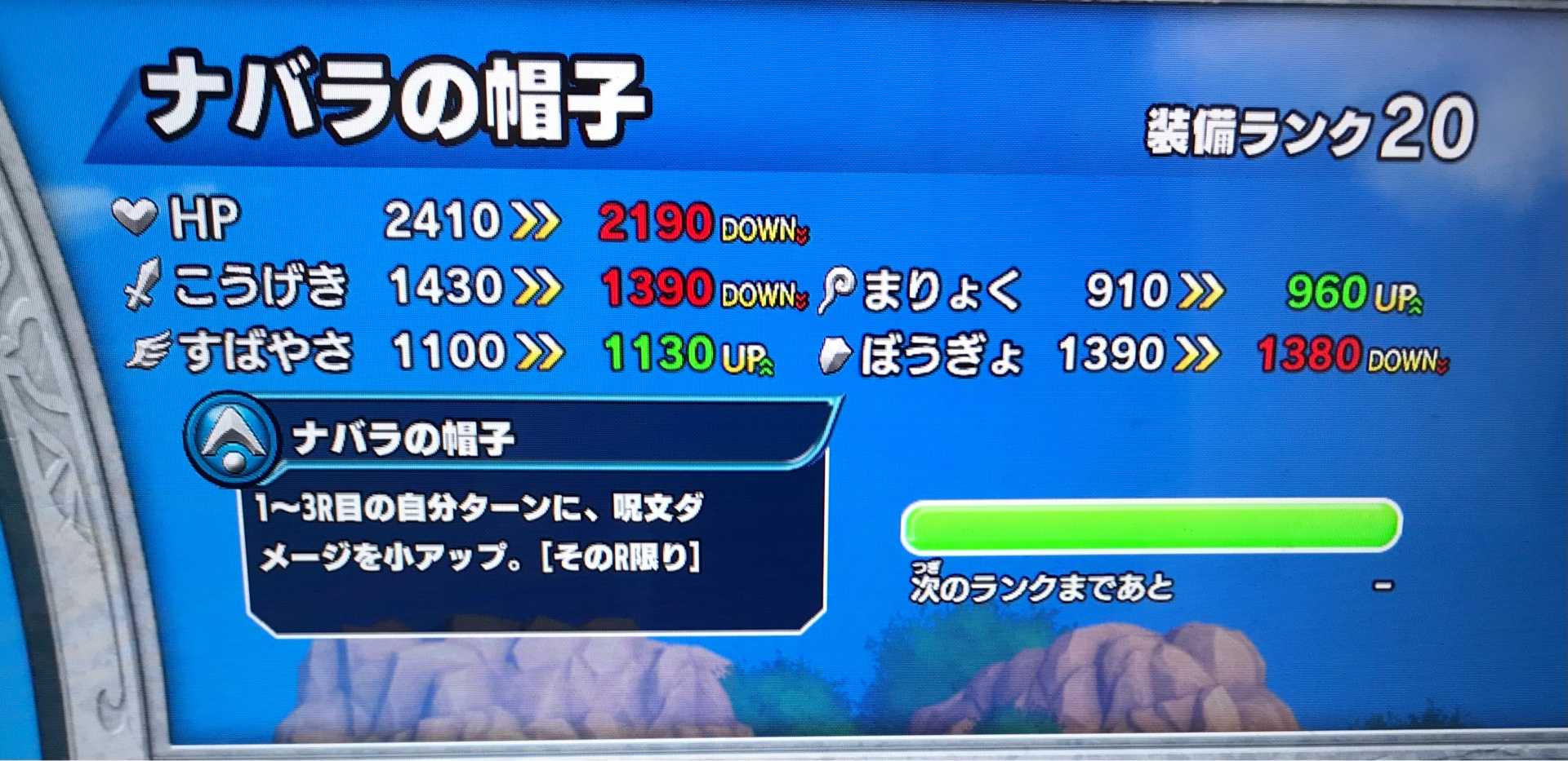 クロスブレイド本日の公開ランキングを見て・・・ええっ!なんでドラキラじゃないの?超竜なのに・・・という(^^;)。こいちゃん、ユウシャさん、yossyさん、武器の選択、流石ですね!私なんてホントは見たくもないドラキラ(笑)で必死に3ターンで倒してたのに、上位3名の方は涼しい顔で2ターン討伐を成功させたのでしょう。いろいろ考えさせられることが多い分、やっぱり「土日限定じゃないランキング」は面白いですね。 昨日ですが、↓がランクMAXになりました。ナバラの帽子が装備ランクMAXになりました!この「百獣全盛時代」に、まりょくがどうのとか呪文がどうのとかの装備を出しても響かないよ~。まして金色装備だし。 さて、残るMAXになってない金色装備はあと3つ。それに加え、「鎧の魔槍」と「竜騎衆の肩当」のランクを上げなければ(肩当が面倒だぁ!)。今日はクロブレオフの日なので、週末が忙しくなりそうです。