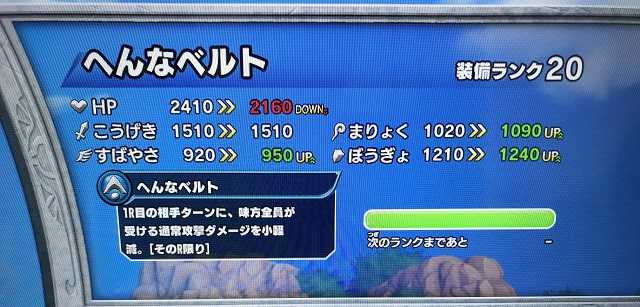 クロスブレイド今日の装備はこれ!へんなベルトが装備ランクMAXになりました!でも、効果を見ても、ちっとも変じゃないですよね。『1R目に味方のこうげき値が倍になる代わりに、味方全員の体力が「1」になる』とかなら十分変なんだけど(笑)。