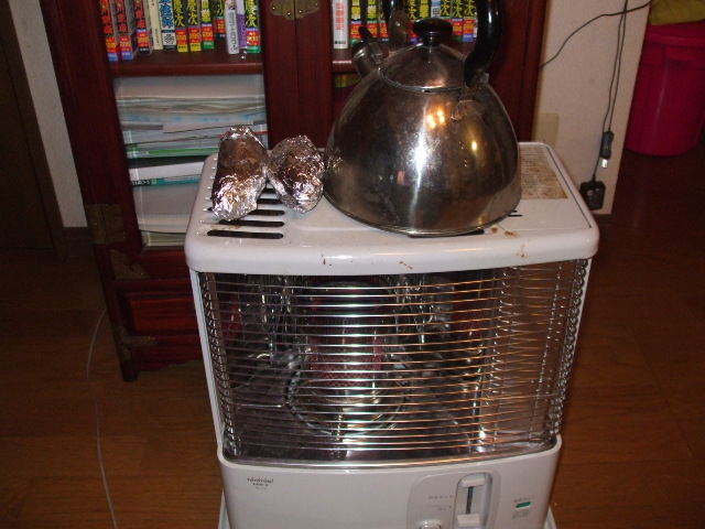 我が家でブームになっている焼き芋の作り方を紹介しますね。原油高騰の中、ファンヒーターは結構灯油を消費しますので、我が家は反射式のストーブを使っています。12月に入っても気温が低くないので充分家の中を暖めてくれます。おかげで、やかんでお湯は沸かせるし、そのやかんから出るスチームで湿度も保てています。その反射式ストーブで、我が家は焼き芋を作っています。 作り方は、甘藷をまず水で綺麗に洗い水分を切らずにキッチンペーパーで全体を巻くように包みます。包んだまま、また水でまんべんなく濡らした後、アルミホイルで巻くように包みます。あとは、ストーブの上に置くだけ。甘藷全体に熱が伝わるように、5分に1回の間隔でひっくり返すようにしてあげれば、約15分から20分で焼き芋が出来上がります。甘くてやわらかくおいしいですよ。