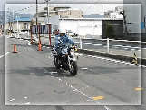 3.急制動急制動は安全に止まる練習です。大型二輪・普通二輪は40Km/hから11m(雨天では14m)以内で停止する。普通二輪(小型限定)では30Km/hから8m(雨天では11m)以内で停止する。この項目は、普通自動二輪も大型自動二輪も40Km/hから11m(雨天では14m)以内で停止しなければならないのですが、400ccと750ccと乗り比べる時間があり、大型自動二輪がいかに難しいかを感じました。本来、急制動は危険な行為なので公道での走行中はすべきではないんですが、ここではいかに冷静に危険回避出来るかの練習と思います。初めは、急制動開始線まで速度40キロの維持が難しく、速度50キロで進入して停止線をオーバーしたり、逆に進入速度未達でやり直しが続きました。また停止するときに、ニュートラルに入れる癖(本来はクラッチを切って、停止後後方確認後ローに入れる)がついていて、停止直前にバランスを崩したりしましたが急制動開始線までの速度維持のコツや落ち着いてブレーキ操作をすることで、一段階後半では難なくクリアー出来るようなりました。