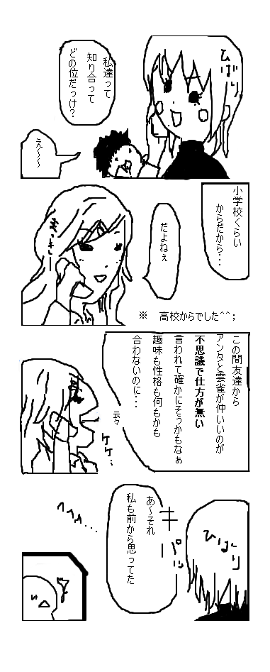 なんとな~く日常のくだらない会話を文章で書いても限界があるように思うので漫画形式でがんばって見ます。時々ね(笑今回は4コマ風で・・・。いやもうほんと・・・小学校とか幼稚園くらいから仲がいいと思うくらい何故か違和感も無く一緒にいてるんですよ(笑でも実際は高校からのお知り合いでした^^;一緒にいるとお互い別の友達から不思議がられます。それくらい友達にはなりそうに無い正反対な私達・・・。でも大好きだ~~~!!この後二人で何で私ら仲良いんだろうね~?なんで一緒にいるんだろうって真剣に考えましたが結論はでませんで(苦笑