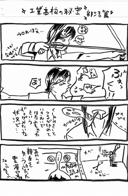 今日は部活篇です。ノンフィクションです(苦笑くしゃみでそうでやばいなぁとか思ってたんですけどね。あげくの果てに弦が切れるとは・・・。離れる瞬間に切れたんですよ~・・・まぢごめんまっきー・・・。心臓止まるかと思った!って皆から言われました。(的からは3mくらい外れてました・・・ちなみに交換漫画日記(勝手に命名)で一番反響が多かったです。ノートの左のページにソレゾレ漫画描いて、右のページに下らんコメント書いたりしてたんですがその感想が一番多かったのはこのネタでした。そのうち他の人が描いたのも載せよぅっと。関係ないけどピルグリムイェーガー6巻買いました。カーリン・・・孔雀様のところにいっちゃいましたね・・・アデールとカーリン2部ではどうなっていく事やら・・・ますます関係ないけどロヨラっていいにくいザビザビよく言えるなぁって毎回感心。拍手感謝です華宵さん高校生らしいものですか?!(笑自己判断でいいならわざとらしく変なのはいていったり・・・私にはその勇気はありませんが^^;(オイ↓押していただけると嬉しいです♪ web拍手