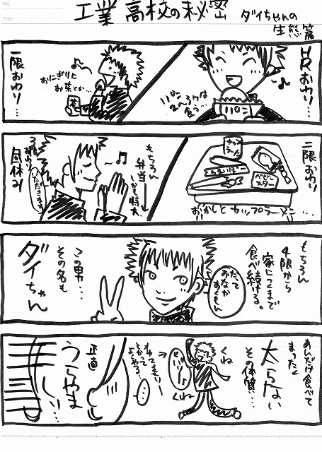 今日は個人ネタです。身内の人間しか面白くないかも(汗 いるんですよね~~どんなに食べても太らない体質・・・。朝学校来てから帰るまでひたすら食べ続ける男ダイちゃん。ほんと動いてるわけでもないのに、食べても太らない!羨ましい!!!お昼のお弁当は大きいの2つ持ってきます(苦笑毎日作っているダイちゃん母を尊敬してしまう・・・でも食べさせがいがありそうですよね。なに食べてもおいしいおいしいって笑顔で食べるんですから結構格好いいんですが、なにしろオカマ走り~~とか公衆の面前でやっちゃう人ですからね暇だと突然踊りだしたり、歌いだしたり・・・。これ載せたのは、工業高校の人間ってヤンキーみたいなイメージ強いらしいのでそんな事は無いんだよという意味で・・・こんな変人ばっかの学校ですよ?顔がいい男は結構おかしいのが(失礼)多いと勉強になる学校でした。