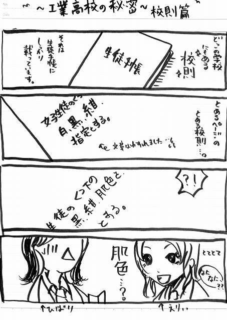 高校の時に眠気覚ましにリレー漫画とか絵しりとりとかした名残です。眠気覚ましに席近い人たちと、この学校の不思議とかやってたのが元ネタです(苦笑なんか日記のネタもないので、下らぬ工業高校の実態漫画を不定期だけど載せていこうと思います。もう投げやりにノートに筆ペン一発描きだったり。醜いのはご容赦くださいな。いや・・・もうホント肌色の靴下って・・・一体。あってもはいていきたくねぇよって感じでした^^;とりあえずはいている人は一人も見かけませんでしたケド。雲雀は紺が多めでした。(キイテナイ