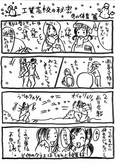 久々に工業高校の秘密を・・・結構溜まってるんで、他のもそのうち載せますね。男子38人に女子2人なんで、体育って暇なんですよ^^;体育館にいるときだと、先生と3人でバドミントンしたり縄跳びしたりまぁしたいことして遊ぶんですけど(ぇ男子は雪上サッカーしてるけどまさか混ざれないしさぁってことで、外となるとこんな感じです(苦笑かまくら作った事もありますよ~雪だるまはもうあちこちに作ってました(笑遊んでるのに単位はもらえたし何より不思議なのが5段階評価で4もらっていた事です。一体何が基準なんだ?先生いわく”お前らほど男女共に、熱い体育するクラスは見たことが無い”だそうです。人間関係崩れそうなくらい激しい体育ですよ^^;(喧嘩のごとし・・・でも仲良し(笑もうすぐ皆卒業なんですね~早いなぁほとんど進路は決まったみたいです。免許取りがんばれよ~~どーれこれからモツ煮作ってきます。圧力鍋で作れば早いんだろうケド、使い方わからん(オイのでコトコト煮てきます~~^^